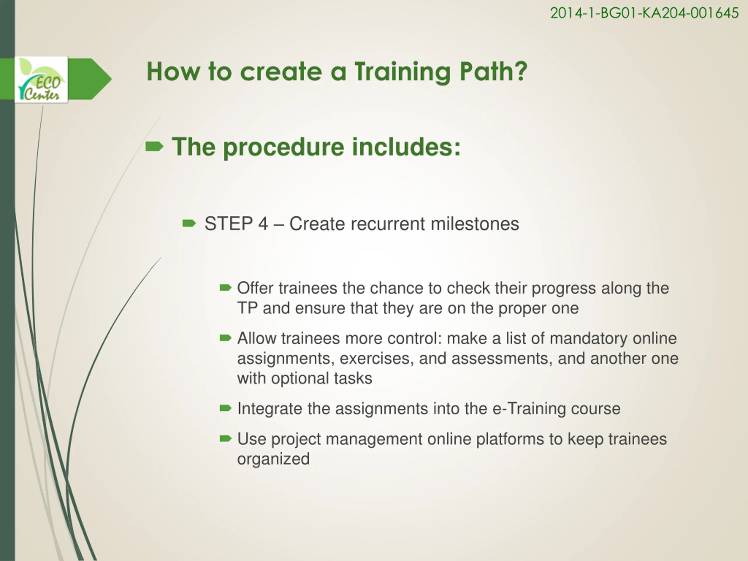 2014-1-BG01-KA204-001645 How to create a Training Path? The procedure includes: STEP 4 Create recurrent milestones Offer trainees the chance to check their progress along the TP and ensure that they are on the proper one Allow trainees more control: make a list of mandatory online assignments, exercises, and assessments, and another one with optional tasks Integrate the assignments into the e-Training course Use project management online platforms to keep trainees organized