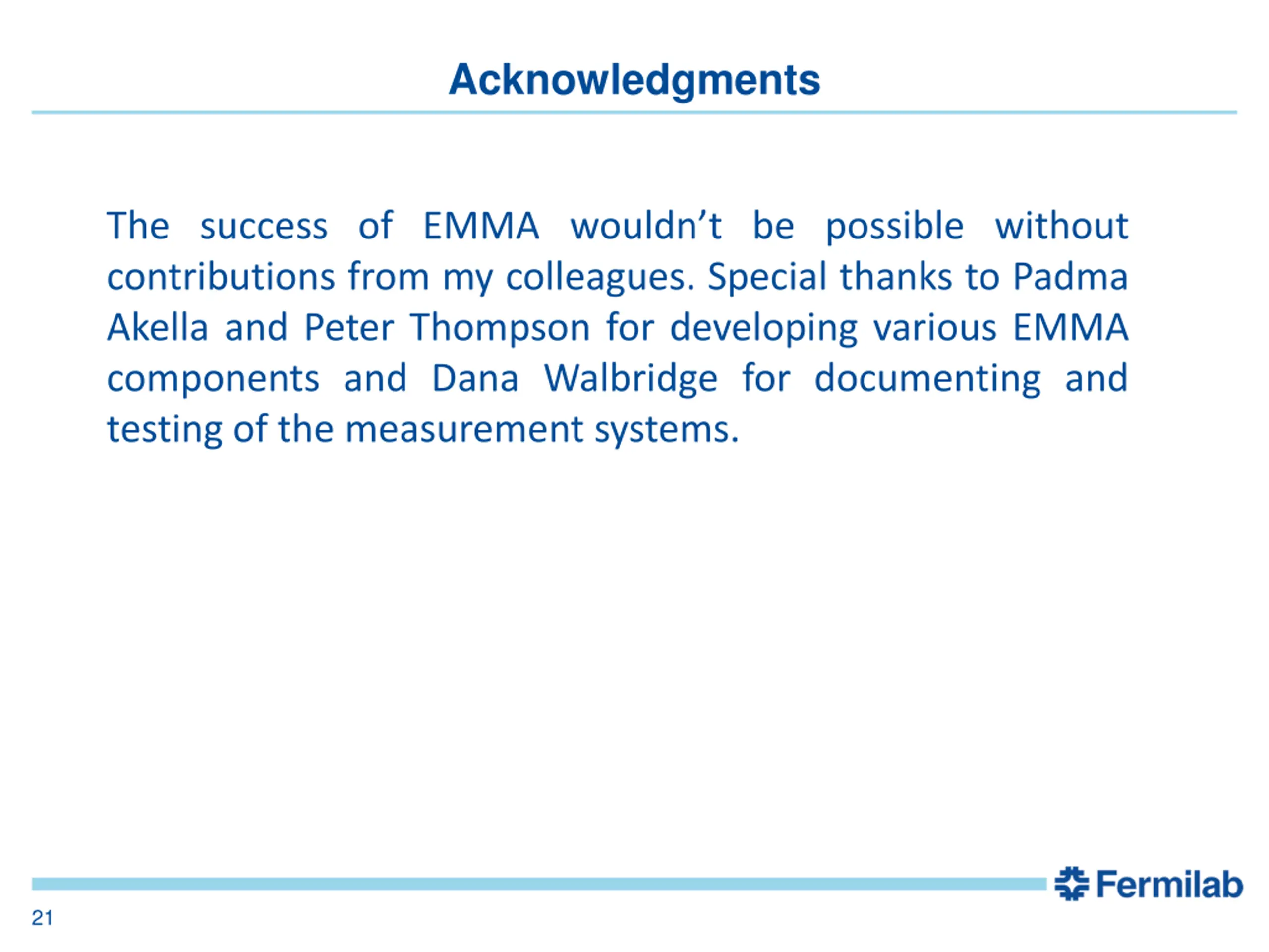 Acknowledgments The success of EMMA wouldn t be possible without contributions from my colleagues. Special thanks to Padma Akella and Peter Thompson for developing various EMMA components and Dana Walbridge for documenting and testing of the measurement systems. 21