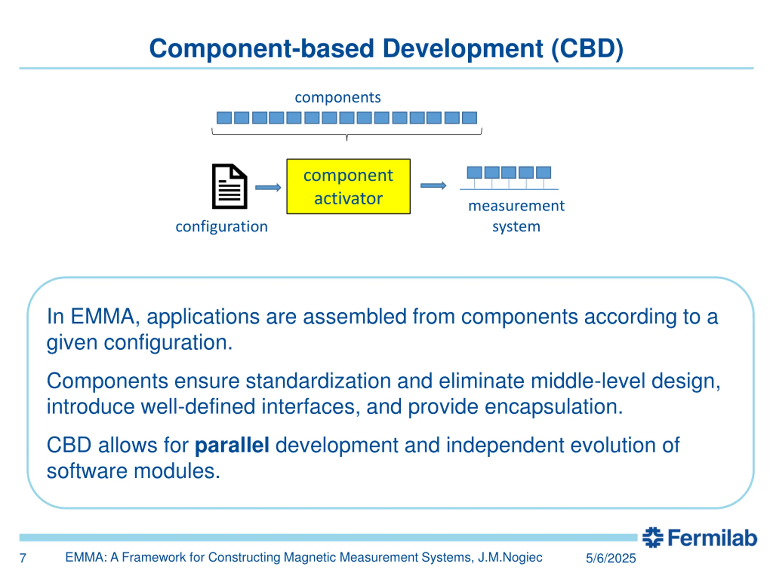 Component-based Development (CBD) components component activator measurement system configuration In EMMA, applications are assembled from components according to a given configuration. Components ensure standardization and eliminate middle-level design, introduce well-defined interfaces, and provide encapsulation. CBD allows for parallel development and independent evolution of software modules. EMMA: A Framework for Constructing Magnetic Measurement Systems, J.M.Nogiec 7 5/6/2025