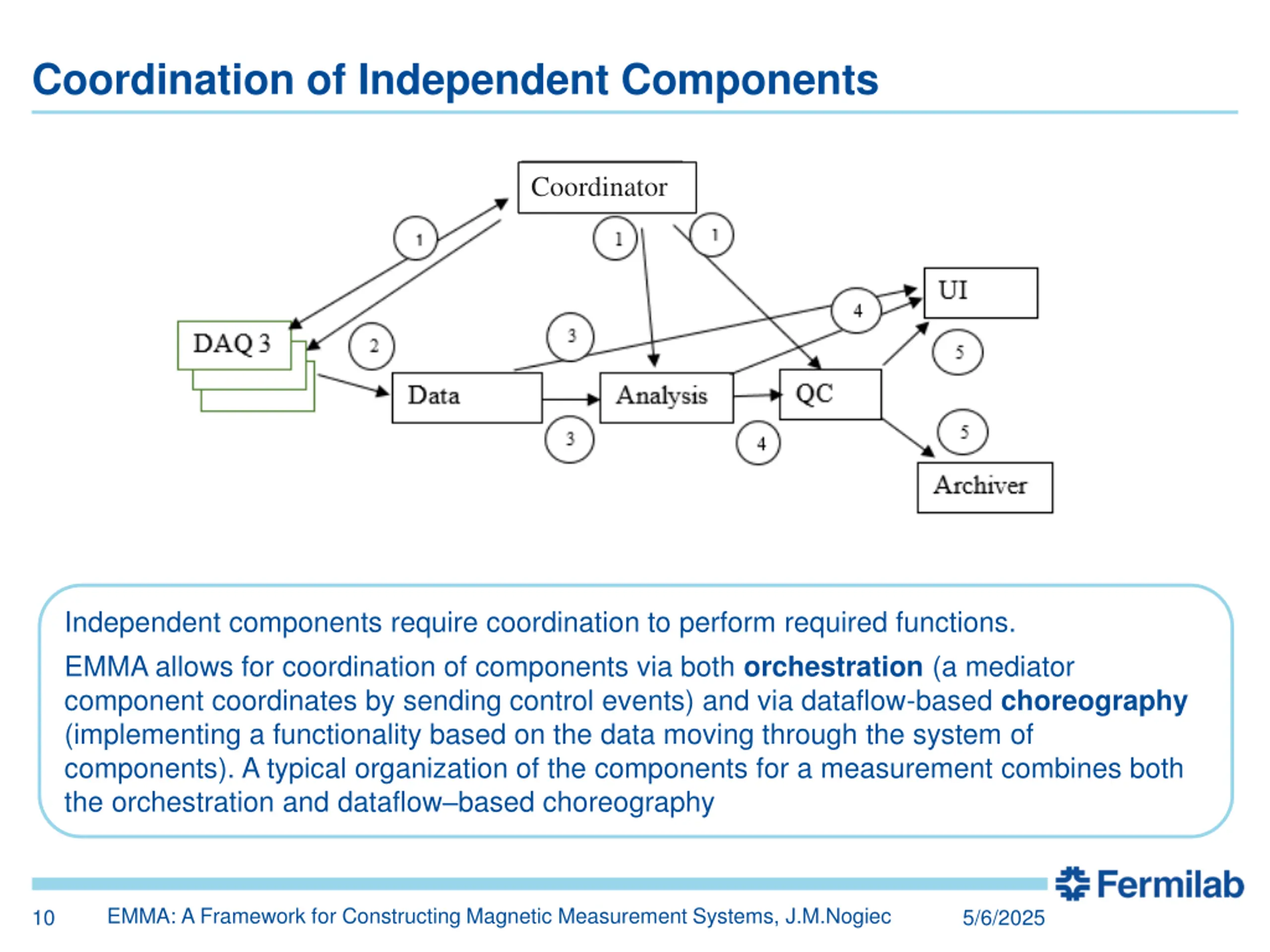 Coordination of Independent Components Coordinator Independent components require coordination to perform required functions. EMMA allows for coordination of components via both orchestration (a mediator component coordinates by sending control events) and via dataflow-based choreography (implementing a functionality based on the data moving through the system of components). A typical organization of the components for a measurement combines both the orchestration and dataflow based choreography EMMA: A Framework for Constructing Magnetic Measurement Systems, J.M.Nogiec 10 5/6/2025