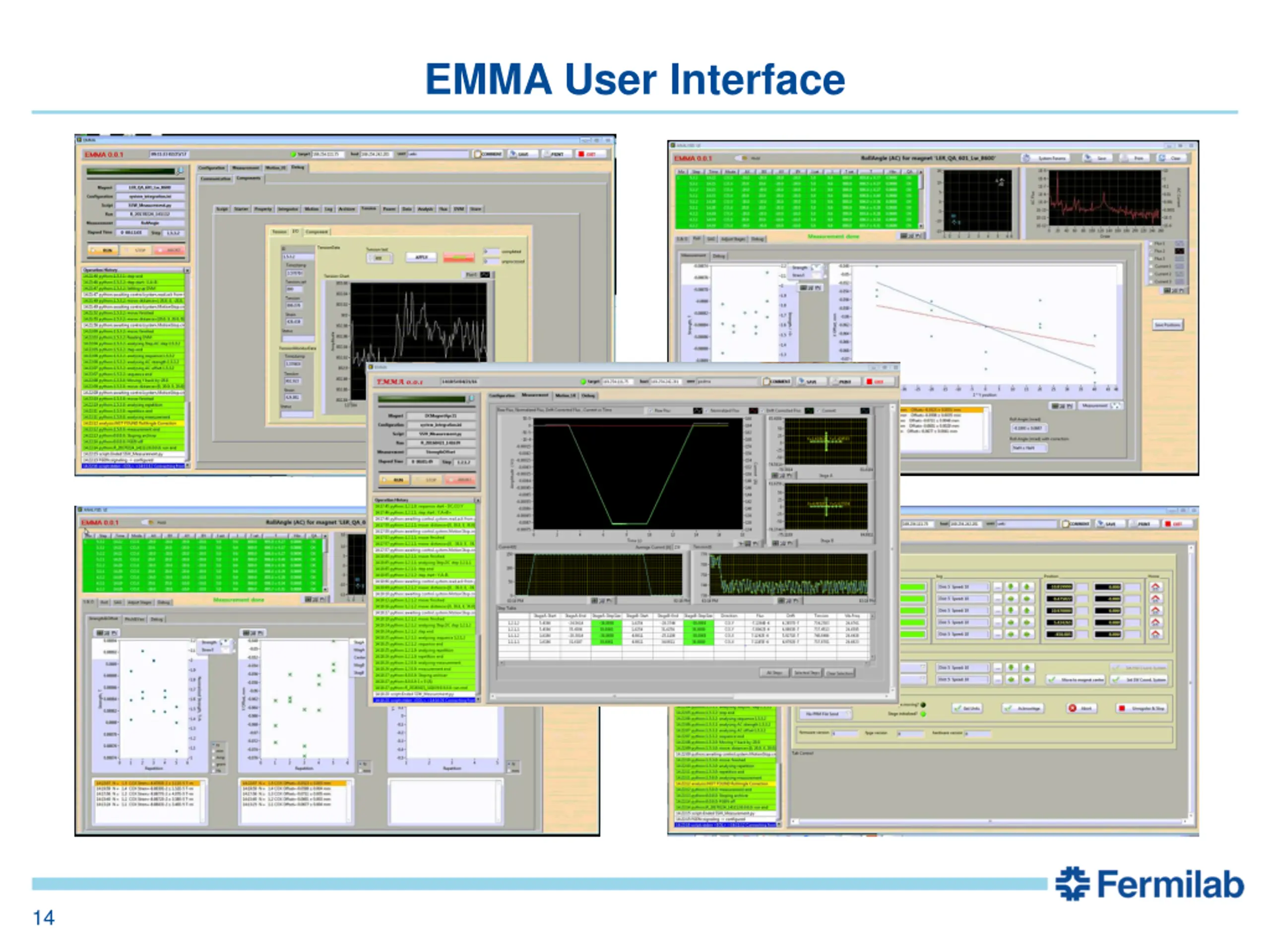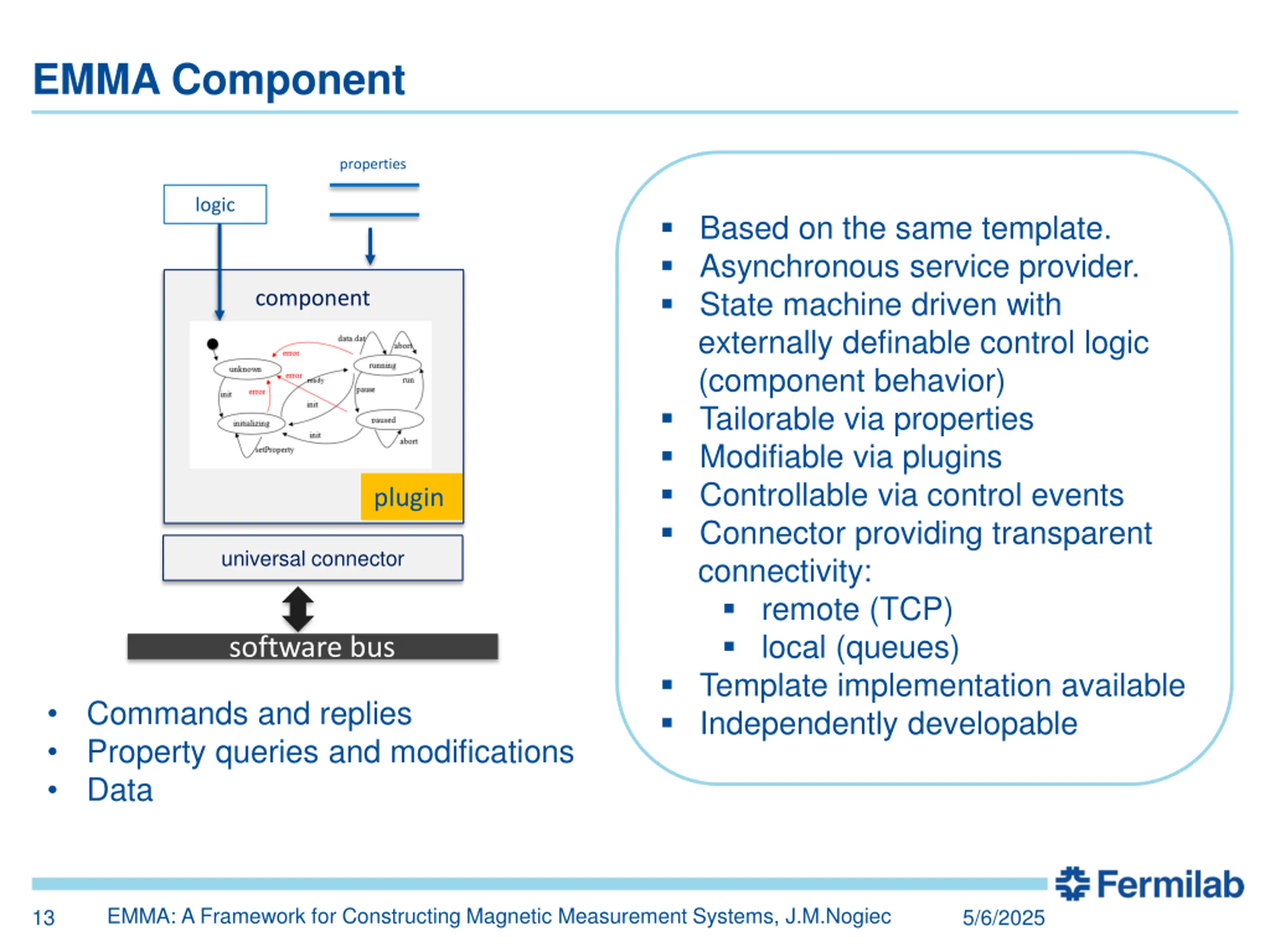 EMMA Component properties logic Based on the same template. Asynchronous service provider. State machine driven with externally definable control logic (component behavior) Tailorable via properties Modifiable via plugins Controllable via control events Connector providing transparent connectivity: remote (TCP) local (queues) Template implementation available Independently developable component plugin universal connector software bus Commands and replies Property queries and modifications Data EMMA: A Framework for Constructing Magnetic Measurement Systems, J.M.Nogiec 13 5/6/2025