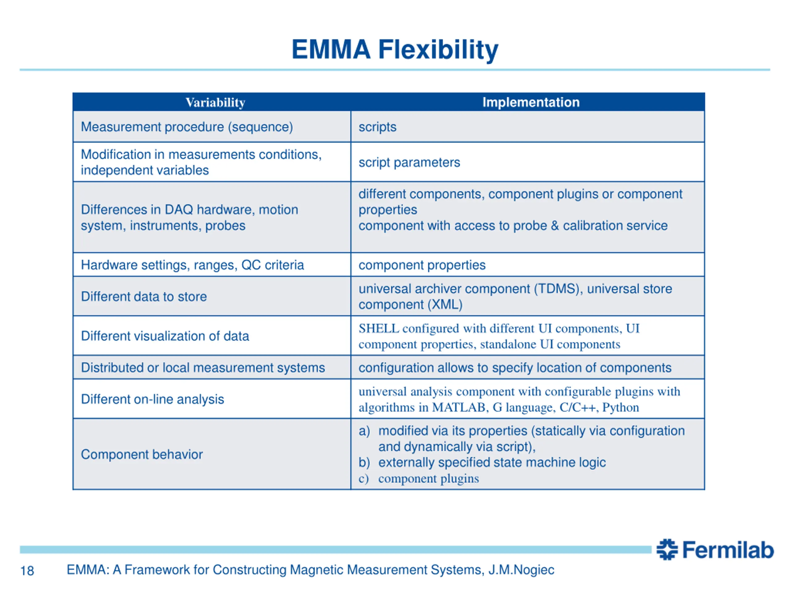 EMMA Flexibility Implementation Variability Measurement procedure (sequence) scripts Modification in measurements conditions, independent variables script parameters different components, component plugins or component properties component with access to probe & calibration service Differences in DAQ hardware, motion system, instruments, probes Hardware settings, ranges, QC criteria component properties universal archiver component (TDMS), universal store component (XML) Different data to store SHELL configured with different UI components, UI component properties, standalone UI components Different visualization of data Distributed or local measurement systems configuration allows to specify location of components universal analysis component with configurable plugins with algorithms in MATLAB, G language, C/C++, Python Different on-line analysis a) modified via its properties (statically via configuration and dynamically via script), b) externally specified state machine logic c) component plugins Component behavior EMMA: A Framework for Constructing Magnetic Measurement Systems, J.M.Nogiec 18