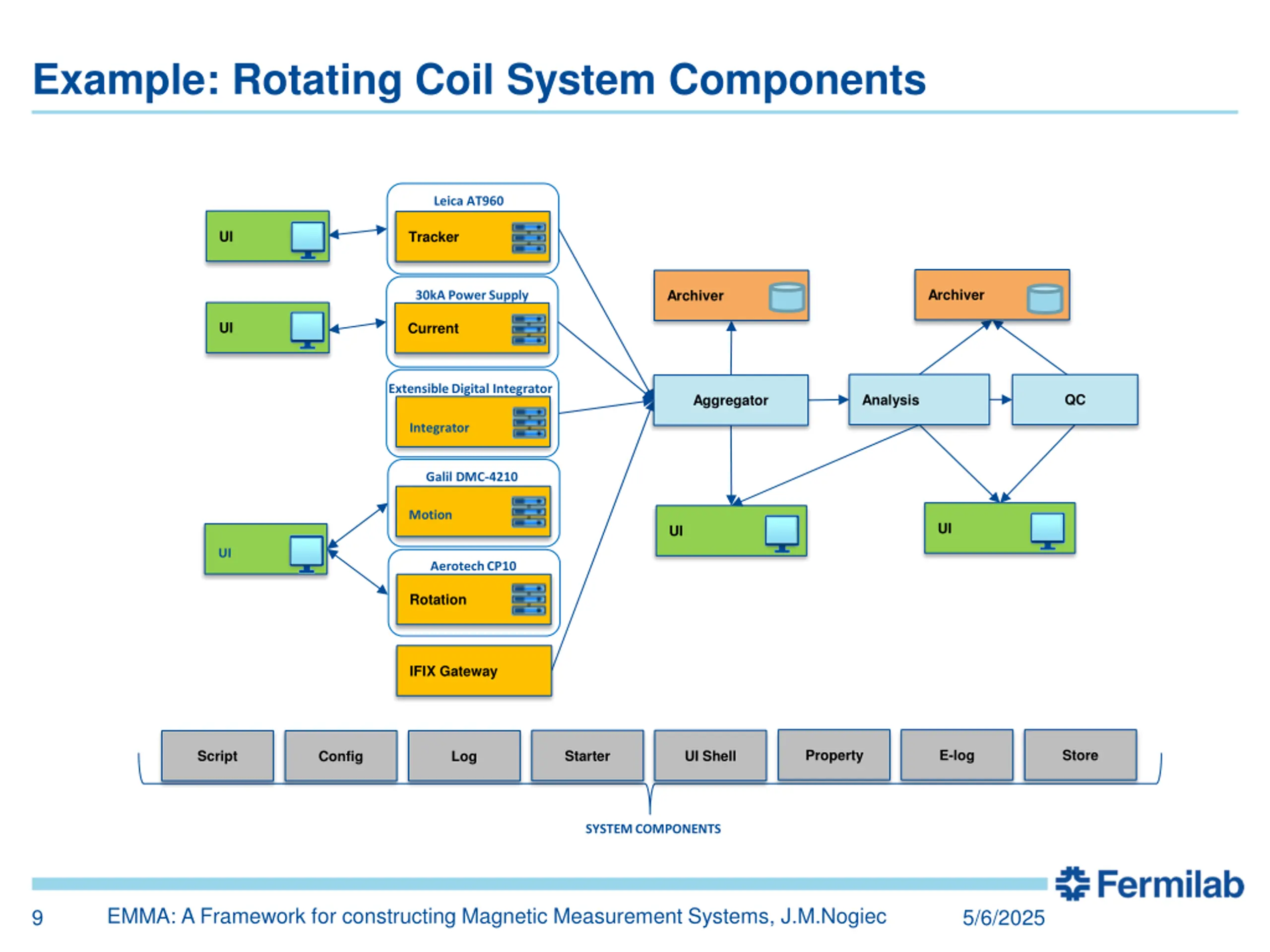 Example: Rotating Coil System Components Leica AT960 UI Tracker Archiver Archiver 30kA Power Supply UI Current Extensible Digital Integrator QC Analysis Aggregator Integrator Galil DMC-4210 Motion UI UI UI Aerotech CP10 Rotation IFIX Gateway Property E-log Store Starter UI Shell Script Config Log SYSTEM COMPONENTS EMMA: A Framework for constructing Magnetic Measurement Systems, J.M.Nogiec 9 5/6/2025