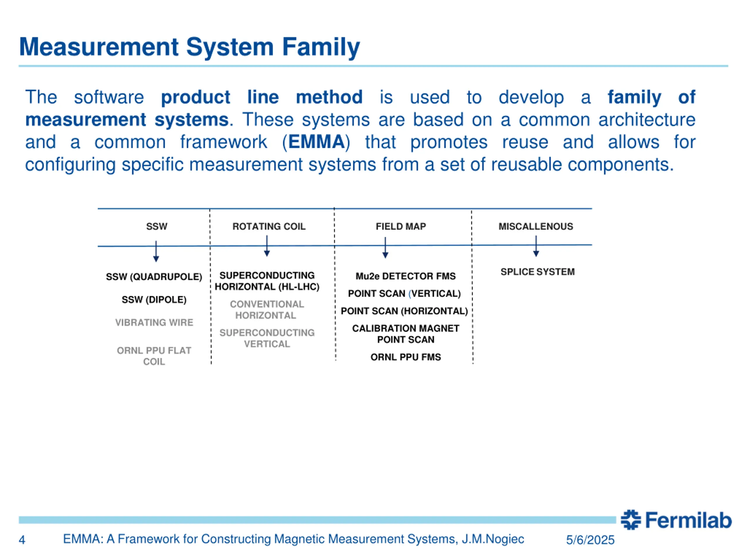 Need and Objective Need Ability to measure a variety of magnets for external and internal use. Objective Reduce cost/effort of developing measurement systems, including efforts to design, implement, test & debug, and rework (reengineering and defect removal) software. Practices REUSE + FLEXIBILITY + EXTENSIBILITY + OBSERVABILITY EMMA: A Framework for Constructing Magnetic Measurement Systems, J.M.Nogiec 3 5/6/2025