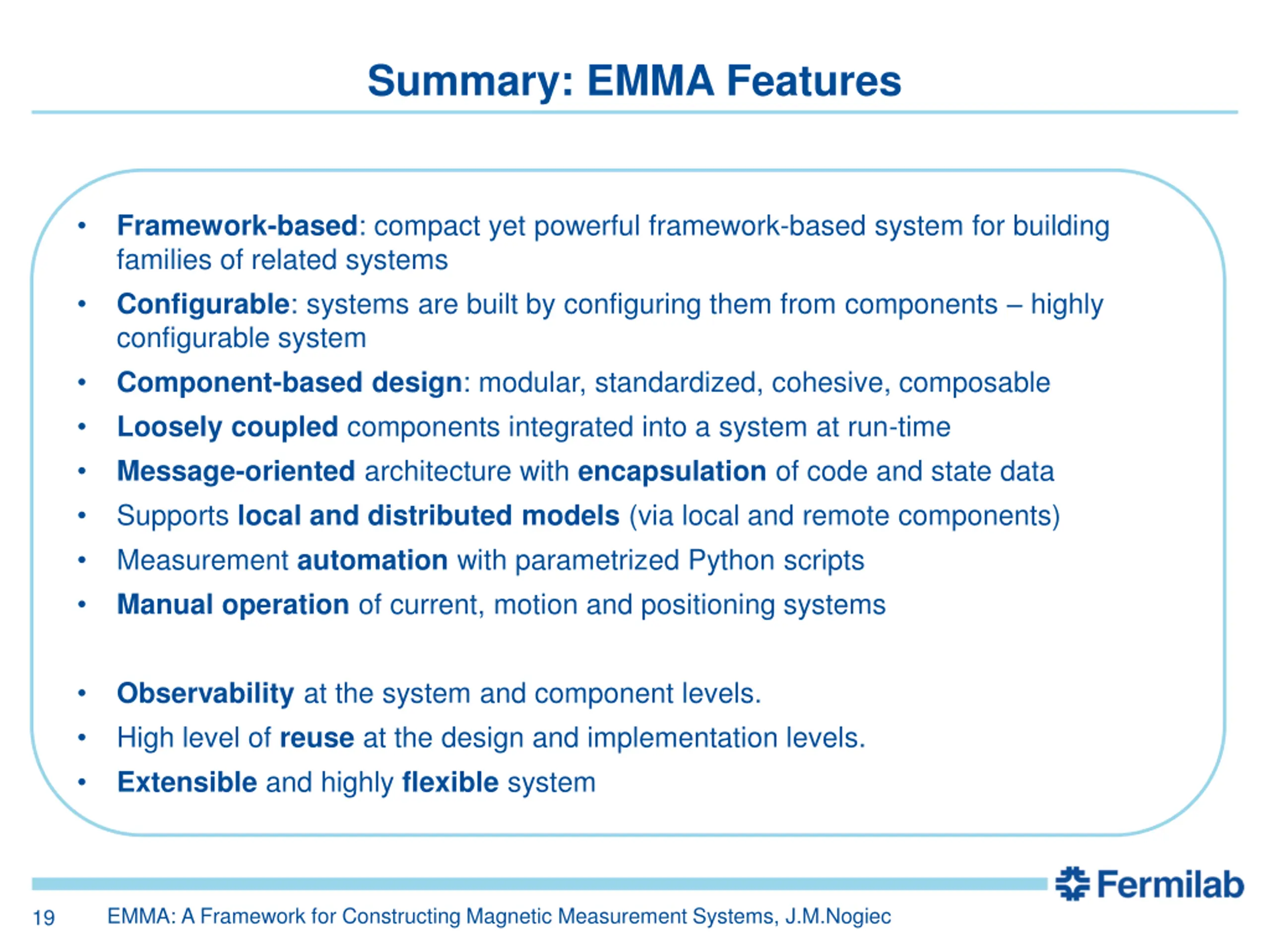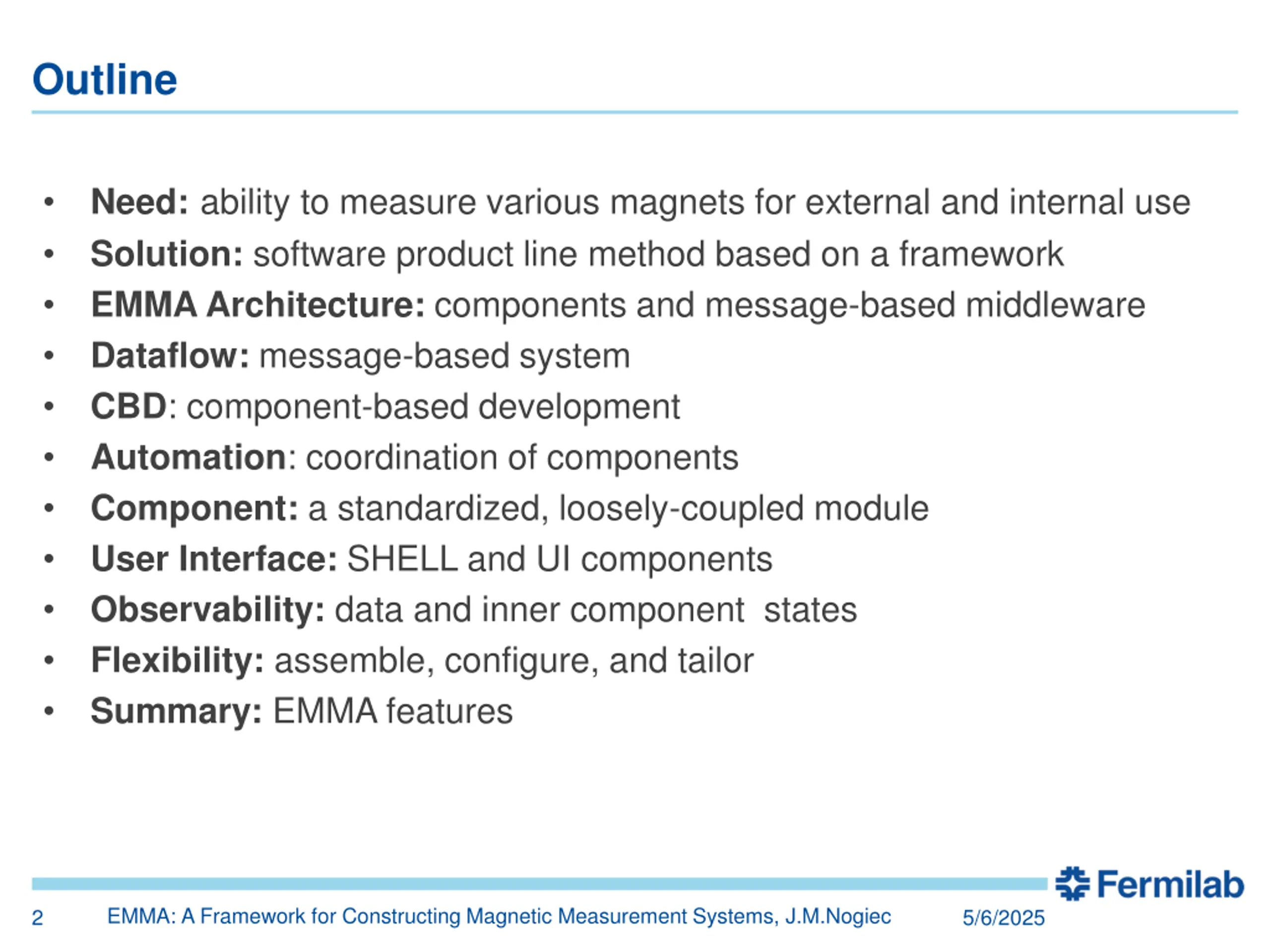 Outline Need:ability to measure various magnets for external and internal use Solution: software product line method based on a framework EMMA Architecture: components and message-based middleware Dataflow: message-based system CBD: component-based development Automation: coordination of components Component: a standardized, loosely-coupled module User Interface: SHELL and UI components Observability: data and inner component states Flexibility: assemble, configure, and tailor Summary: EMMA features EMMA: A Framework for Constructing Magnetic Measurement Systems, J.M.Nogiec 2 5/6/2025