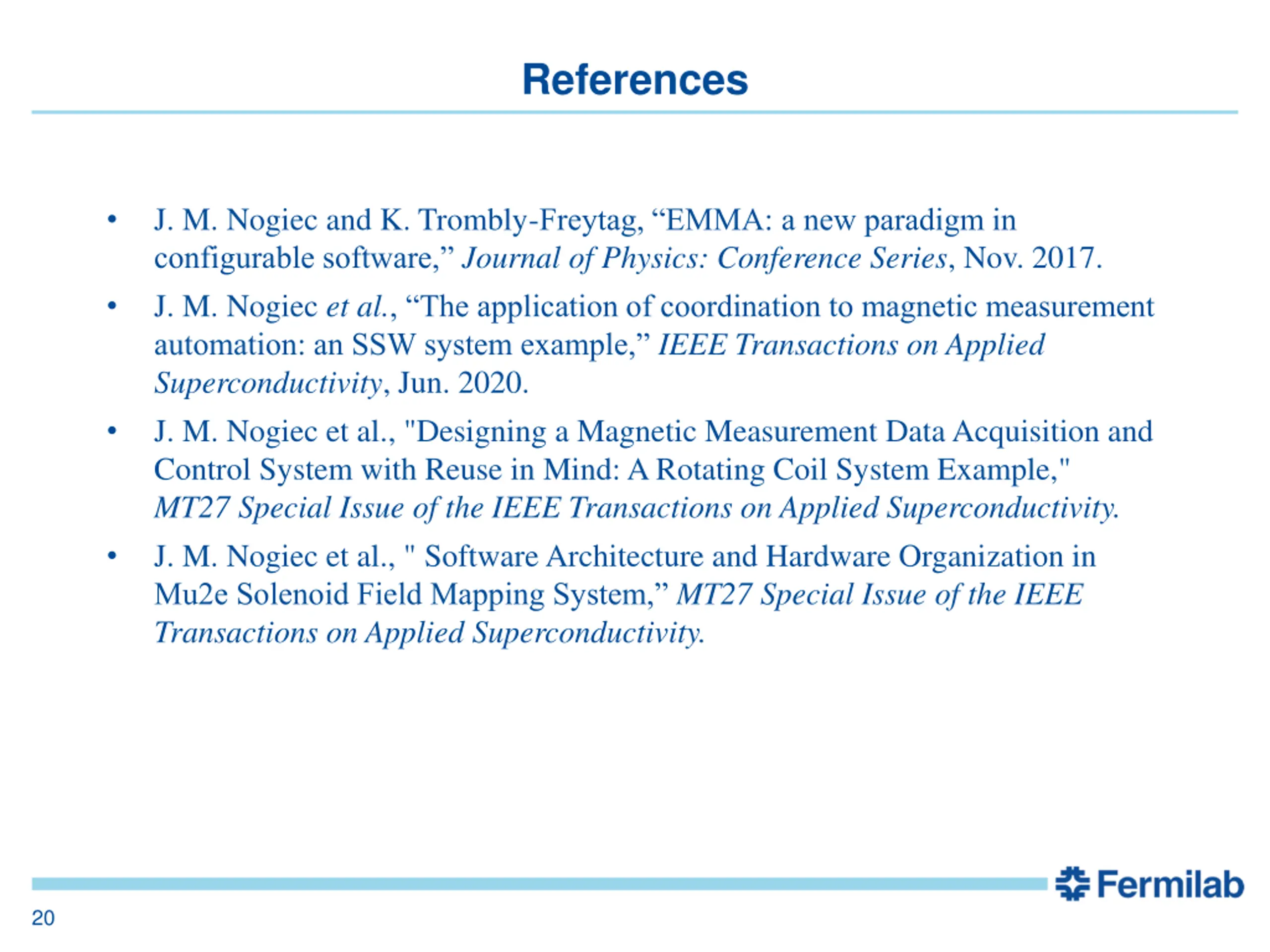 References J. M. Nogiec and K. Trombly-Freytag, EMMA: a new paradigm in configurable software, Journal of Physics: Conference Series, Nov. 2017. J. M. Nogiec et al., The application of coordination to magnetic measurement automation: an SSW system example, IEEE Transactions on Applied Superconductivity, Jun. 2020. J. M. Nogiec et al., "Designing a Magnetic Measurement Data Acquisition and Control System with Reuse in Mind: A Rotating Coil System Example," MT27 Special Issue of the IEEE Transactions on Applied Superconductivity. J. M. Nogiec et al., " Software Architecture and Hardware Organization in Mu2e Solenoid Field Mapping System, MT27 Special Issue of the IEEE Transactions on Applied Superconductivity. 20