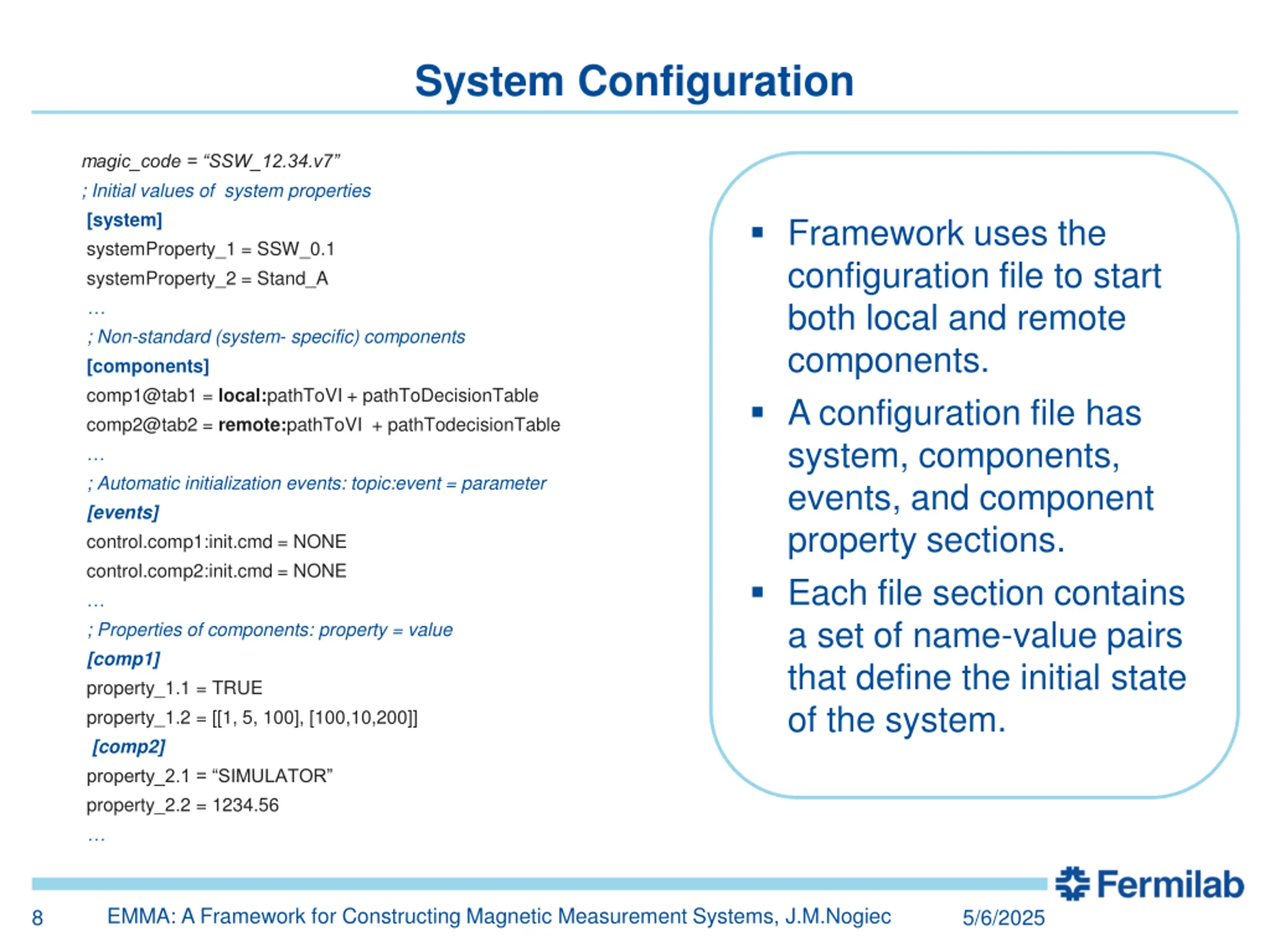 System Configuration magic_code = SSW_12.34.v7 ; Initial values of system properties [system] systemProperty_1 = SSW_0.1 systemProperty_2 = Stand_A ; Non-standard (system- specific) components [components] comp1@tab1 = local:pathToVI + pathToDecisionTable comp2@tab2 = remote:pathToVI + pathTodecisionTable ; Automatic initialization events: topic:event = parameter [events] control.comp1:init.cmd = NONE control.comp2:init.cmd = NONE ; Properties of components: property = value [comp1] property_1.1 = TRUE property_1.2 = [[1, 5, 100], [100,10,200]] [comp2] property_2.1 = SIMULATOR property_2.2 = 1234.56 Framework uses the configuration file to start both local and remote components. A configuration file has system, components, events, and component property sections. Each file section contains a set of name-value pairs that define the initial state of the system. EMMA: A Framework for Constructing Magnetic Measurement Systems, J.M.Nogiec 8 5/6/2025