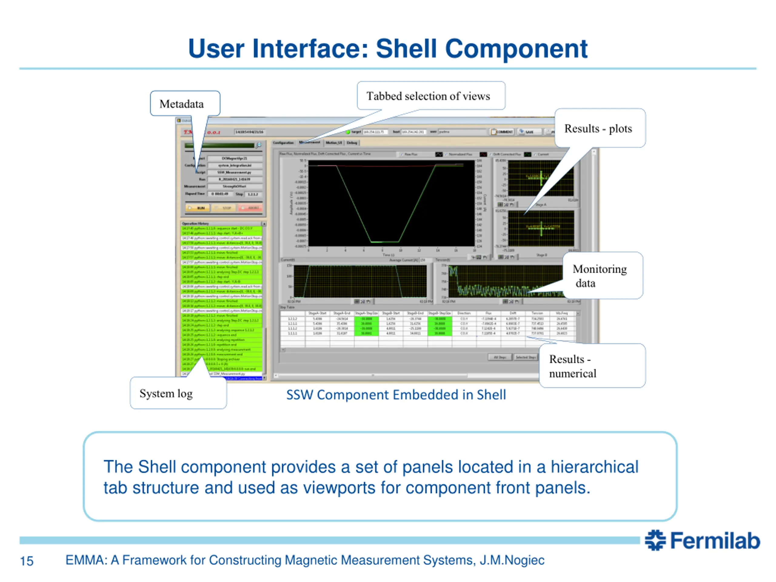 User Interface: Shell Component Tabbed selection of views Metadata Results - plots Monitoring data Results - numerical System log SSW Component Embedded in Shell The Shell component provides a set of panels located in a hierarchical tab structure and used as viewports for component front panels. EMMA: A Framework for Constructing Magnetic Measurement Systems, J.M.Nogiec 15