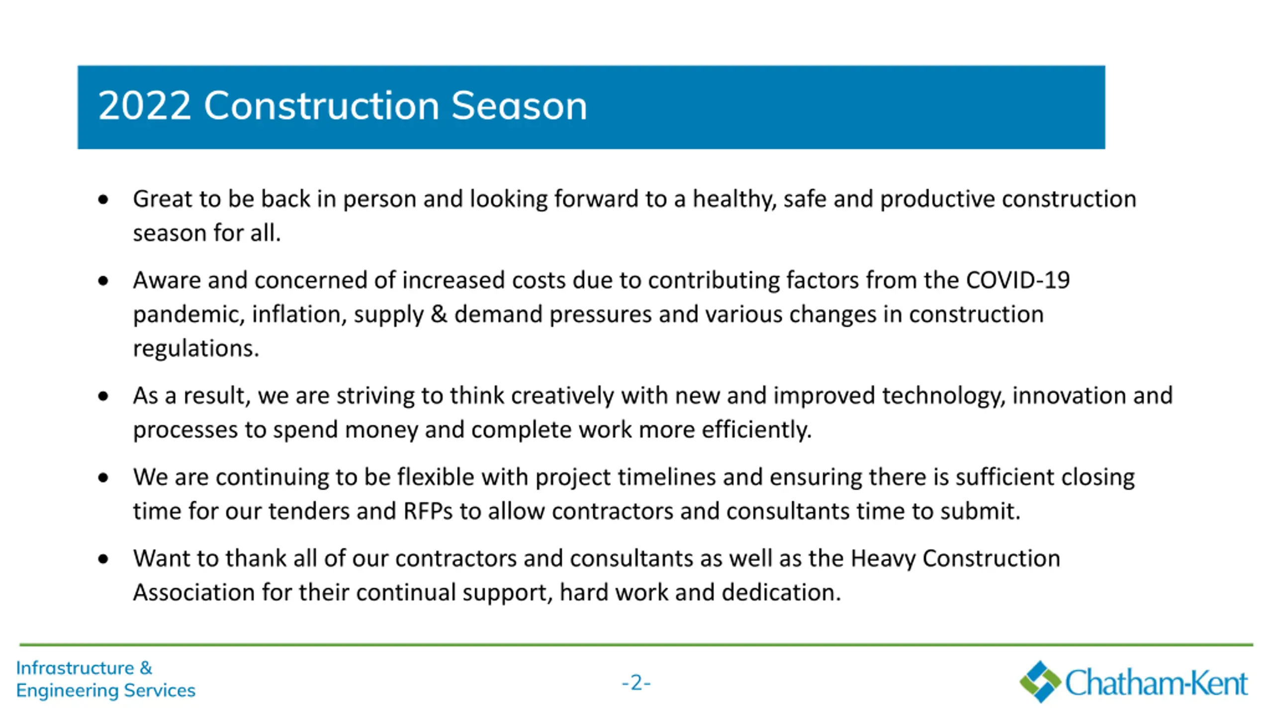 2022 Construction Season Great to be back in person and looking forward to a healthy, safe and productive construction season for all. Aware and concerned of increased costs due to contributing factors from the COVID-19 pandemic, inflation, supply & demand pressures and various changes in construction regulations. As a result, we are striving to think creatively with new and improved technology, innovation and processes to spend money and complete work more efficiently. We are continuing to be flexible with project timelines and ensuring there is sufficient closing time for our tenders and RFPs to allow contractors and consultants time to submit. Want to thank all of our contractors and consultants as well as the Heavy Construction Association for their continual support, hard work and dedication. Infrastructure & Engineering Services -2-