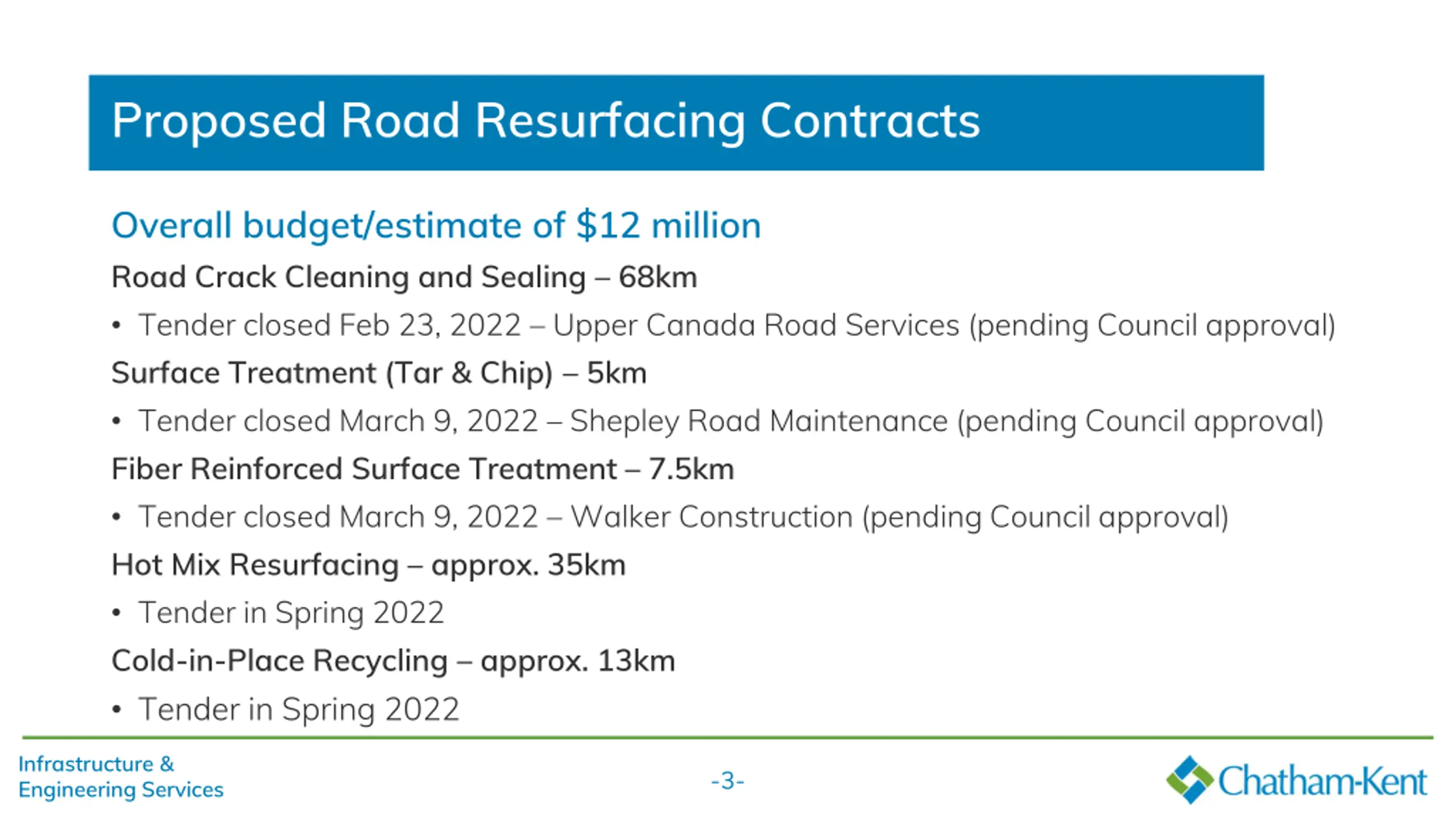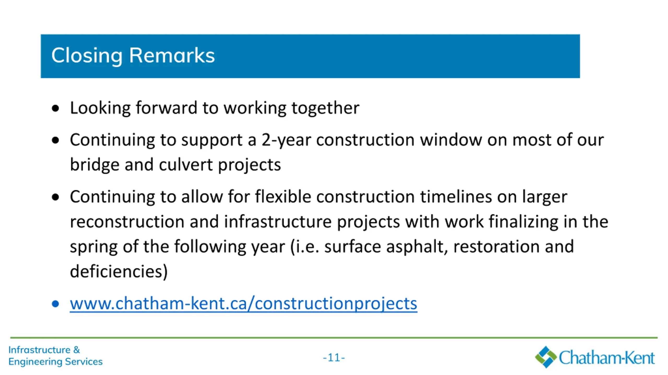 Closing Remarks Looking forward to working together Continuing to support a 2-year construction window on most of our bridge and culvert projects Continuing to allow for flexible construction timelines on larger reconstruction and infrastructure projects with work finalizing in the spring of the following year (i.e. surface asphalt, restoration and deficiencies) www.chatham-kent.ca/constructionprojects Infrastructure & Engineering Services -11-