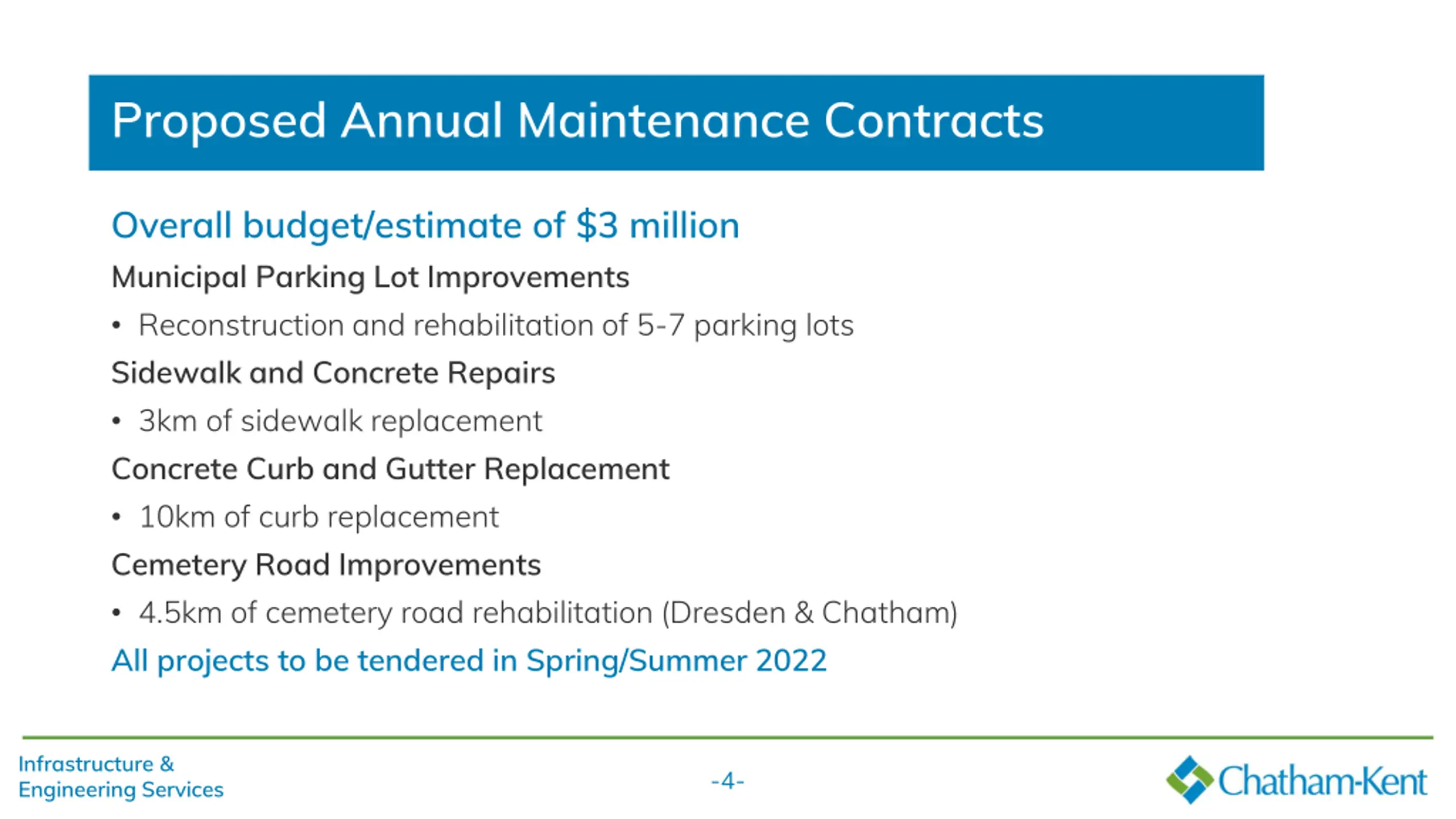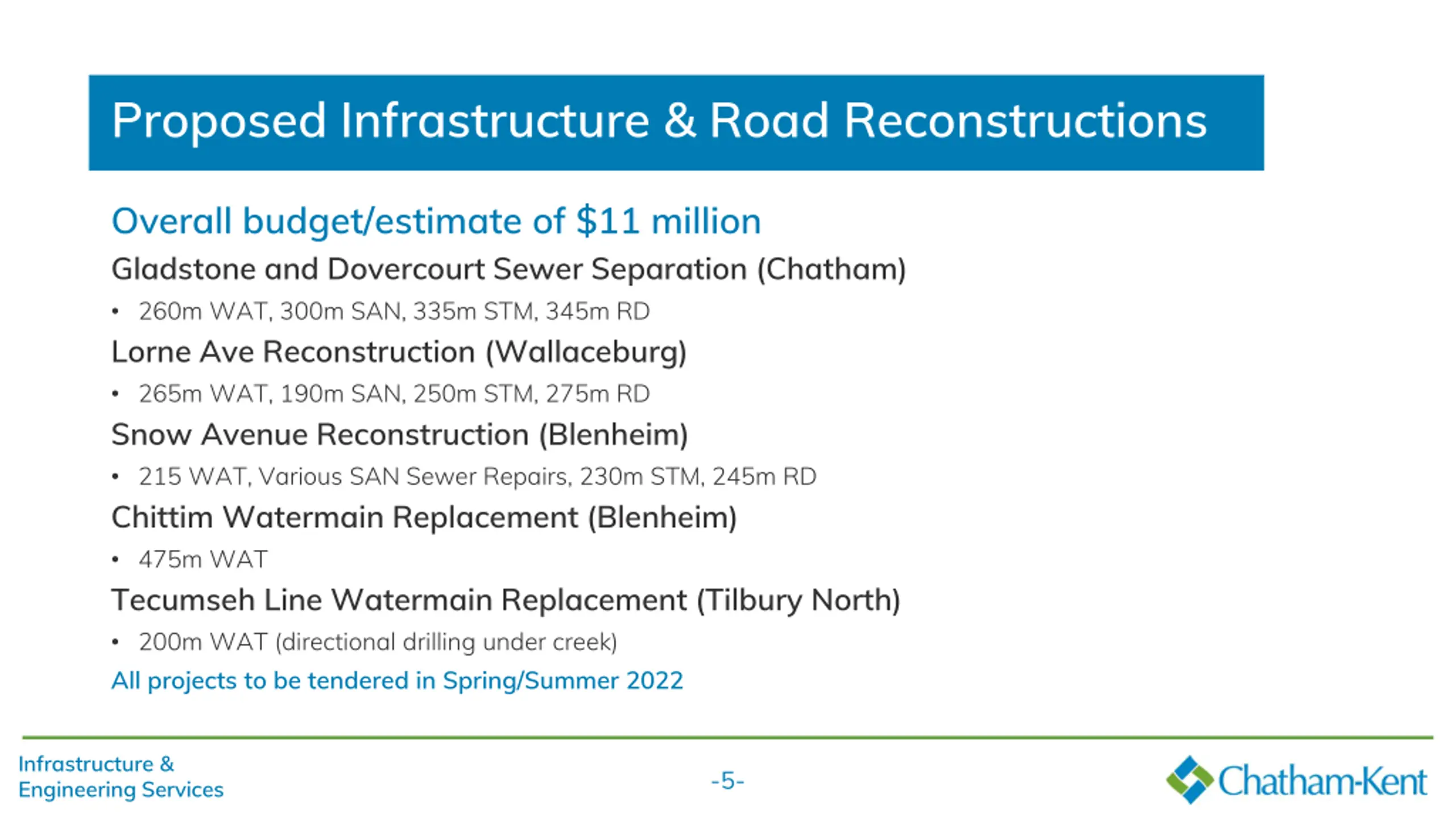 Proposed Annual Maintenance Contracts Overall budget/estimate of $3 million Municipal Parking Lot Improvements Reconstruction and rehabilitation of 5-7 parking lots Sidewalk and Concrete Repairs 3km of sidewalk replacement Concrete Curb and Gutter Replacement 10km of curb replacement Cemetery Road Improvements 4.5km of cemetery road rehabilitation (Dresden & Chatham) All projects to be tendered in Spring/Summer 2022 Infrastructure & Engineering Services -4-