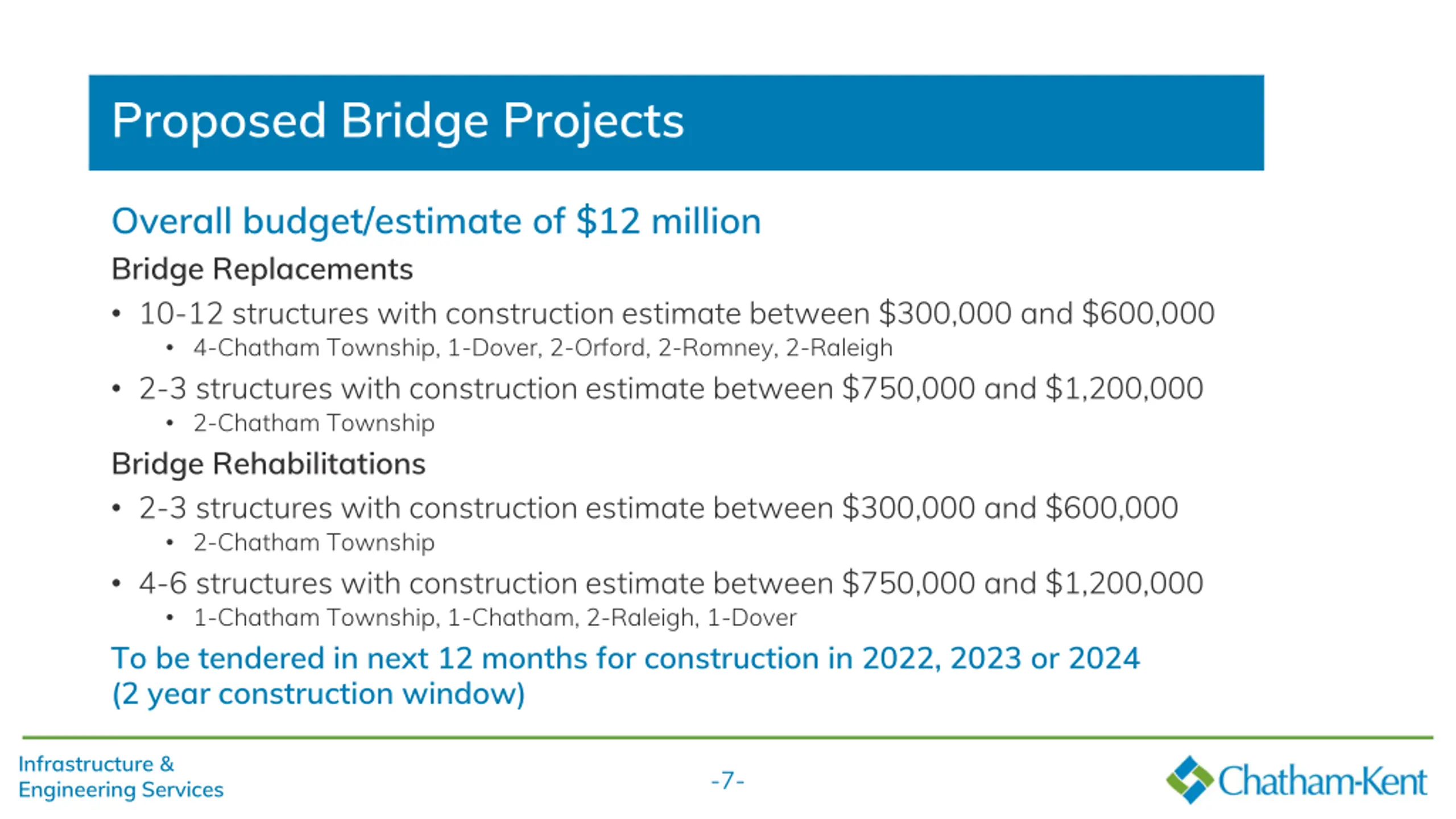 Proposed Infrastructure & Road Reconstructions Cont Queen St North 401 Watermain Crossing (Tilbury) 130m WAT Mariners Road Storm Sewer Replacement (Erieau) 800m STM Base Line Sanitary Forcemain Replacement (Wallaceburg) 600m SAN Forcemain McDonald Tap Storm Pump Station Replacement (Wallaceburg) Lamila St Watermain Relocation (Thamesville) 60m WAT (directional drilling under creek) Merritt Ave Storm Sewer Reconstruction (Chatham) 250m STM All projects to be tendered in Spring/Summer 2022 Infrastructure & Engineering Services -6-