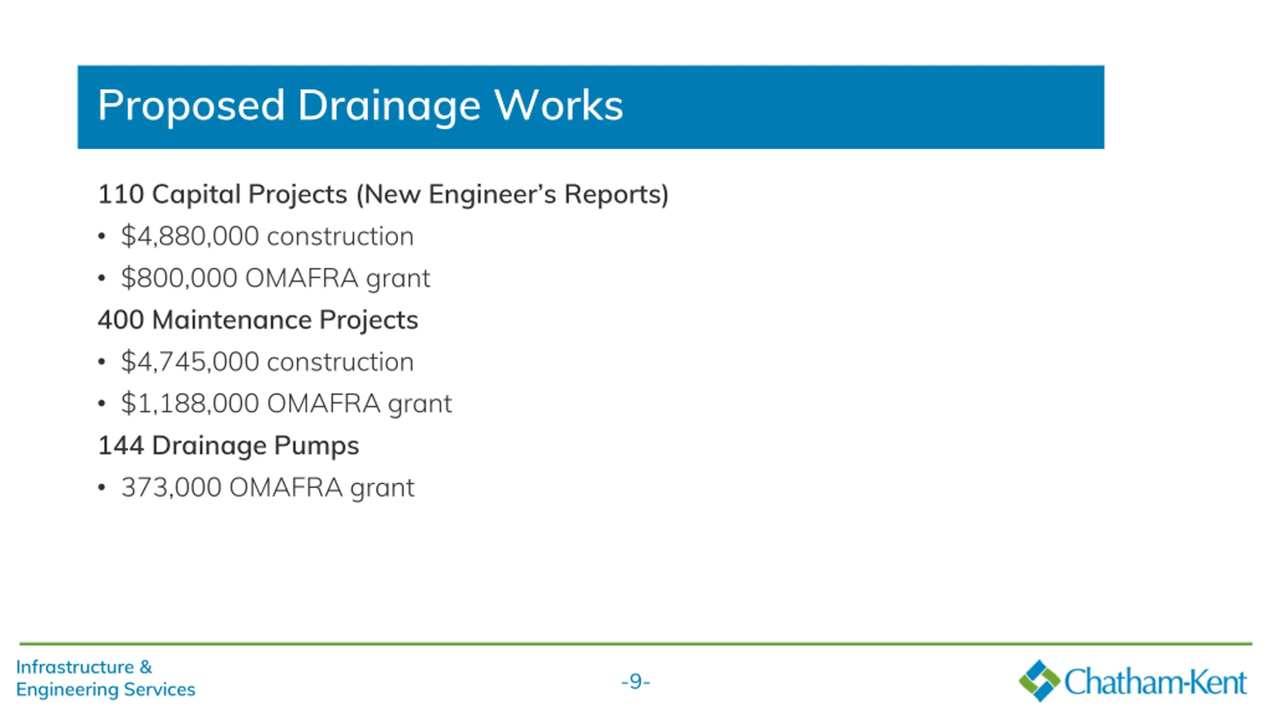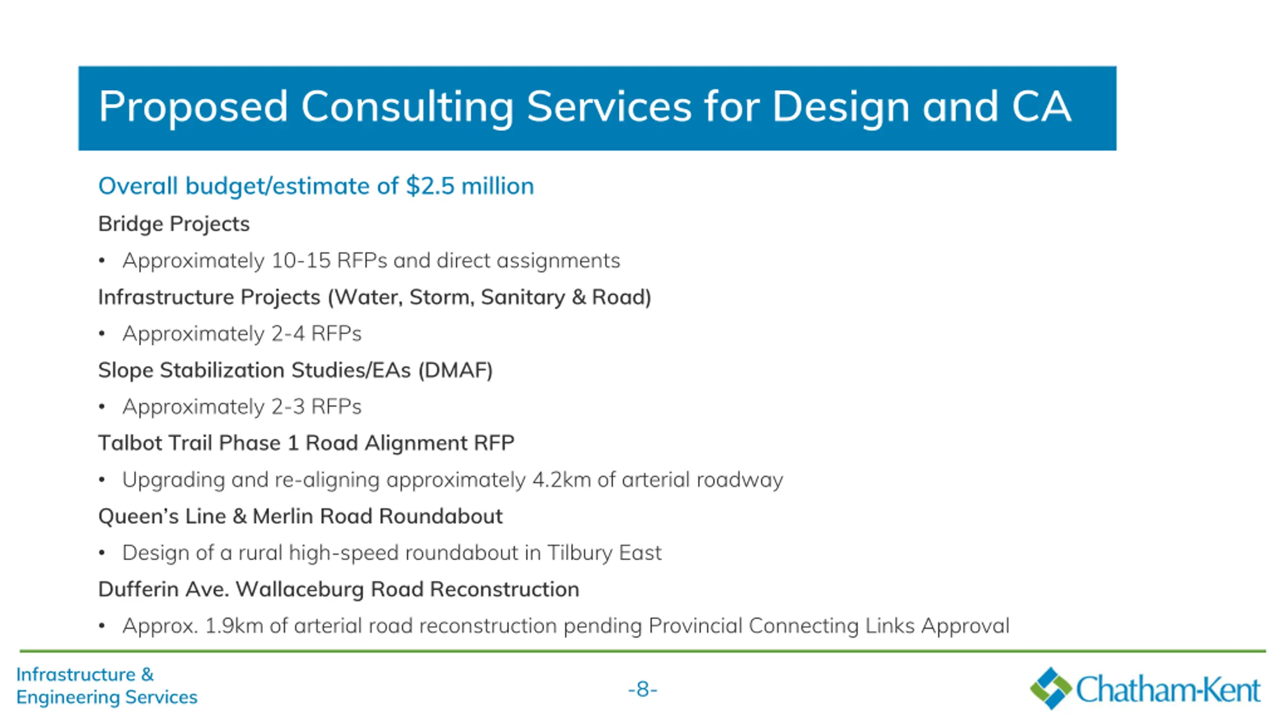 Proposed Consulting Services for Design and CA Overall budget/estimate of $2.5 million Bridge Projects Approximately 10-15 RFPs and direct assignments Infrastructure Projects (Water, Storm, Sanitary & Road) Approximately 2-4 RFPs Slope Stabilization Studies/EAs (DMAF) Approximately 2-3 RFPs Talbot Trail Phase 1 Road Alignment RFP Upgrading and re-aligning approximately 4.2km of arterial roadway Queen s Line & Merlin Road Roundabout Design of a rural high-speed roundabout in Tilbury East Dufferin Ave. Wallaceburg Road Reconstruction Approx. 1.9km of arterial road reconstruction pending Provincial Connecting Links Approval Infrastructure & Engineering Services -8-