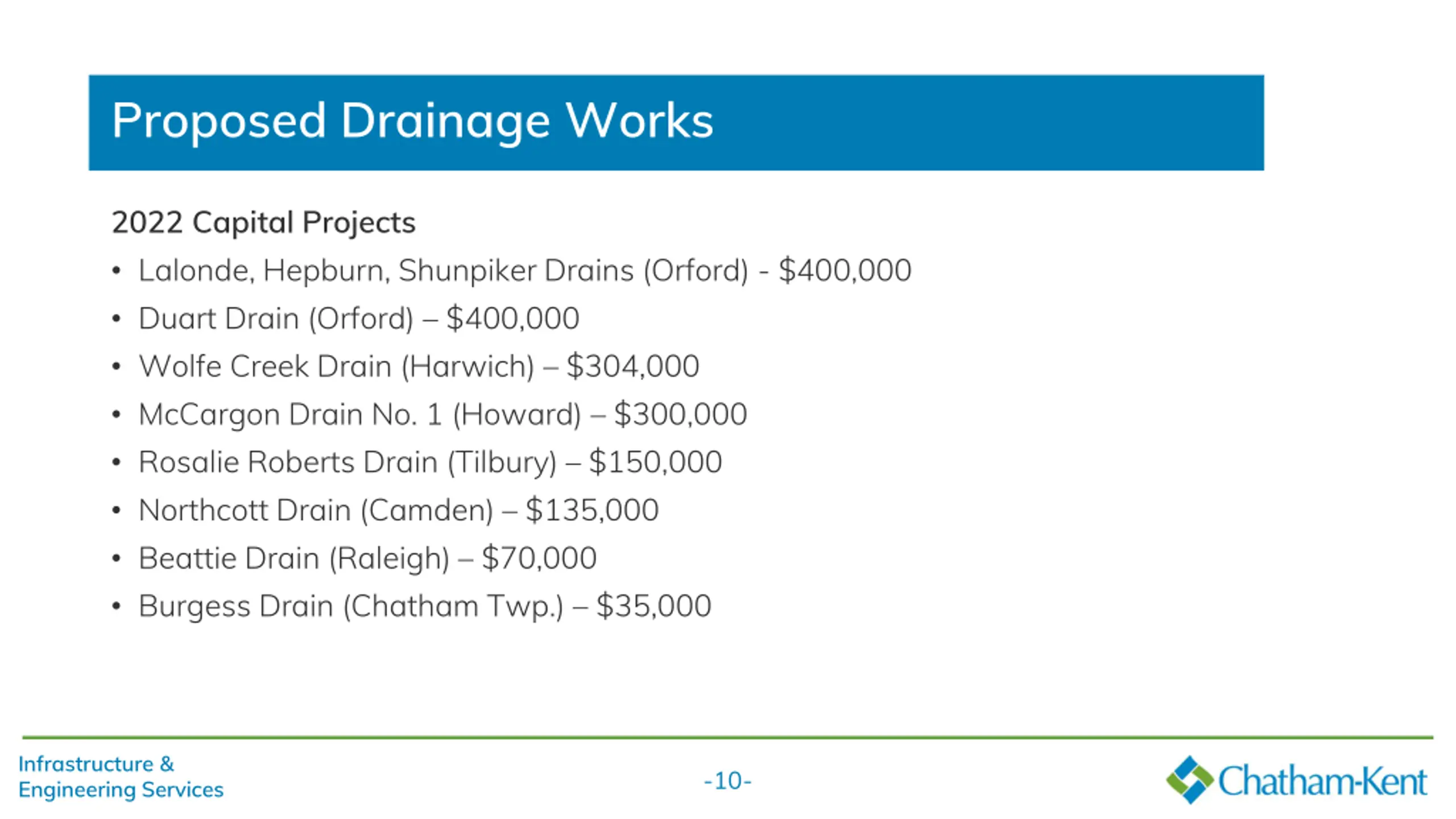 Proposed Drainage Works 110 Capital Projects (New Engineer s Reports) $4,880,000 construction $800,000 OMAFRA grant 400 Maintenance Projects $4,745,000 construction $1,188,000 OMAFRA grant 144 Drainage Pumps 373,000 OMAFRA grant Infrastructure & Engineering Services -9-