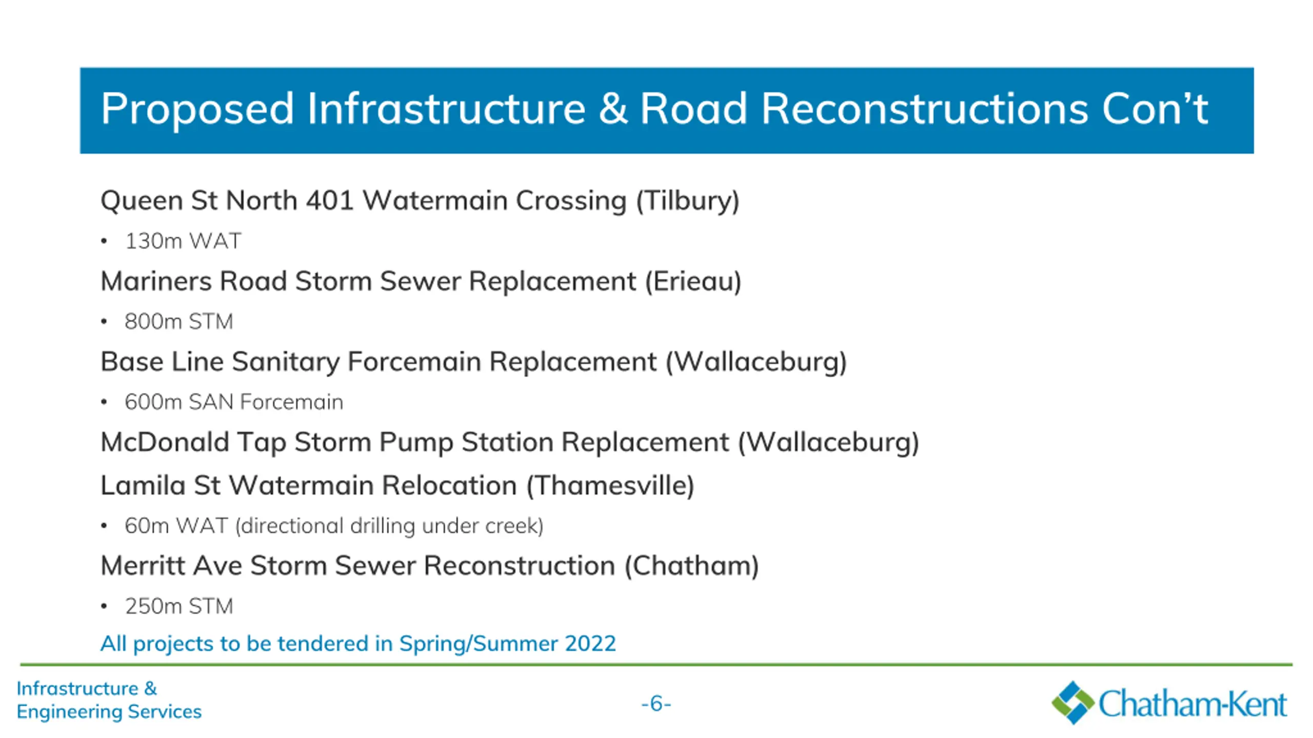 Proposed Infrastructure & Road Reconstructions Overall budget/estimate of $11 million Gladstone and Dovercourt Sewer Separation (Chatham) 260m WAT, 300m SAN, 335m STM, 345m RD Lorne Ave Reconstruction (Wallaceburg) 265m WAT, 190m SAN, 250m STM, 275m RD Snow Avenue Reconstruction (Blenheim) 215 WAT, Various SAN Sewer Repairs, 230m STM, 245m RD Chittim Watermain Replacement (Blenheim) 475m WAT Tecumseh Line Watermain Replacement (Tilbury North) 200m WAT (directional drilling under creek) All projects to be tendered in Spring/Summer 2022 Infrastructure & Engineering Services -5-