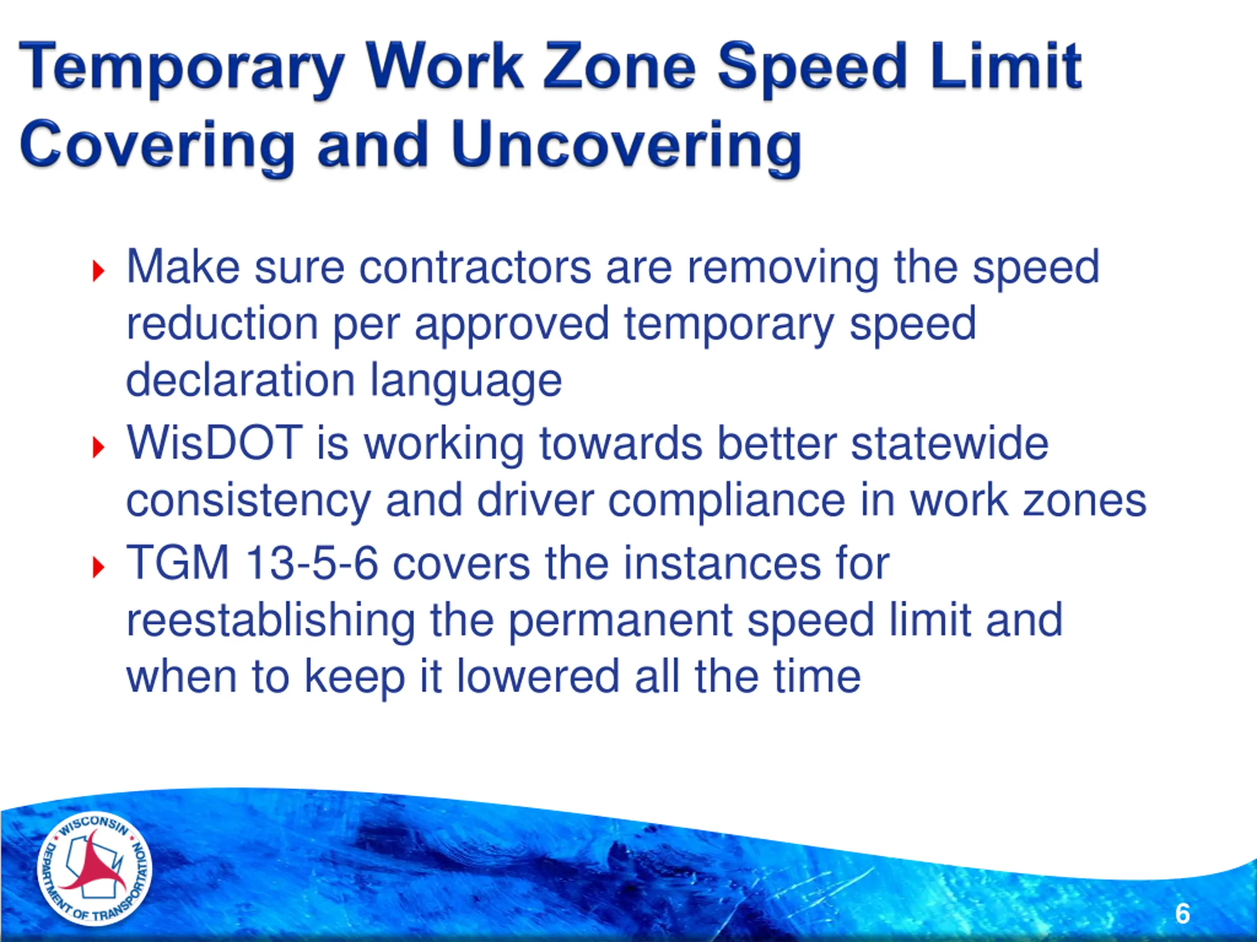 Make sure contractors are removing the speed reduction per approved temporary speed declaration language WisDOT is working towards better statewide consistency and driver compliance in work zones TGM 13-5-6 covers the instances for reestablishing the permanent speed limit and when to keep it lowered all the time 6