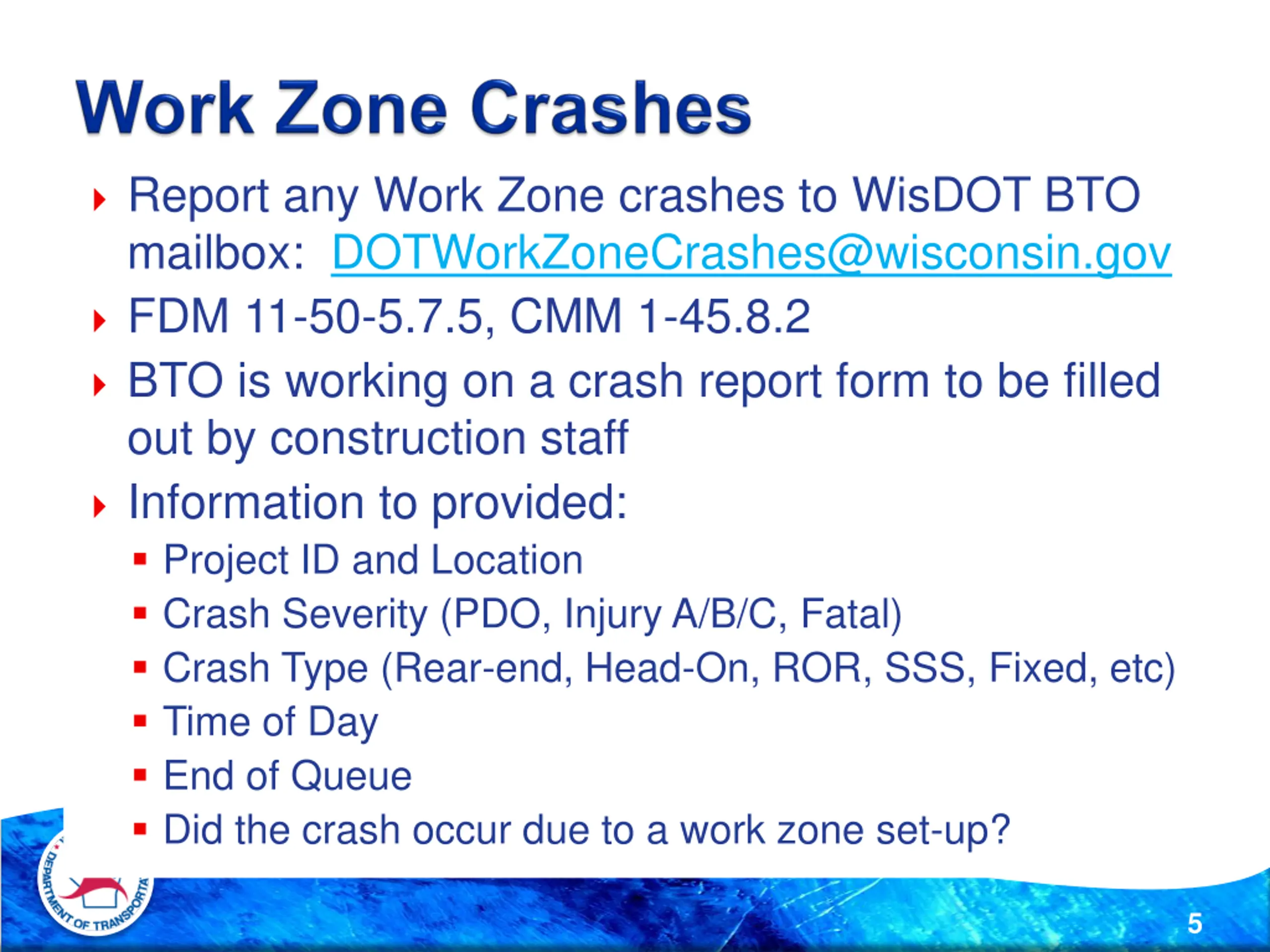 Report any Work Zone crashes to WisDOT BTO mailbox: DOTWorkZoneCrashes@wisconsin.gov FDM 11-50-5.7.5, CMM 1-45.8.2 BTO is working on a crash report form to be filled out by construction staff Information to provided: Project ID and Location Crash Severity (PDO, Injury A/B/C, Fatal) Crash Type (Rear-end, Head-On, ROR, SSS, Fixed, etc) Time of Day End of Queue Did the crash occur due to a work zone set-up? 5