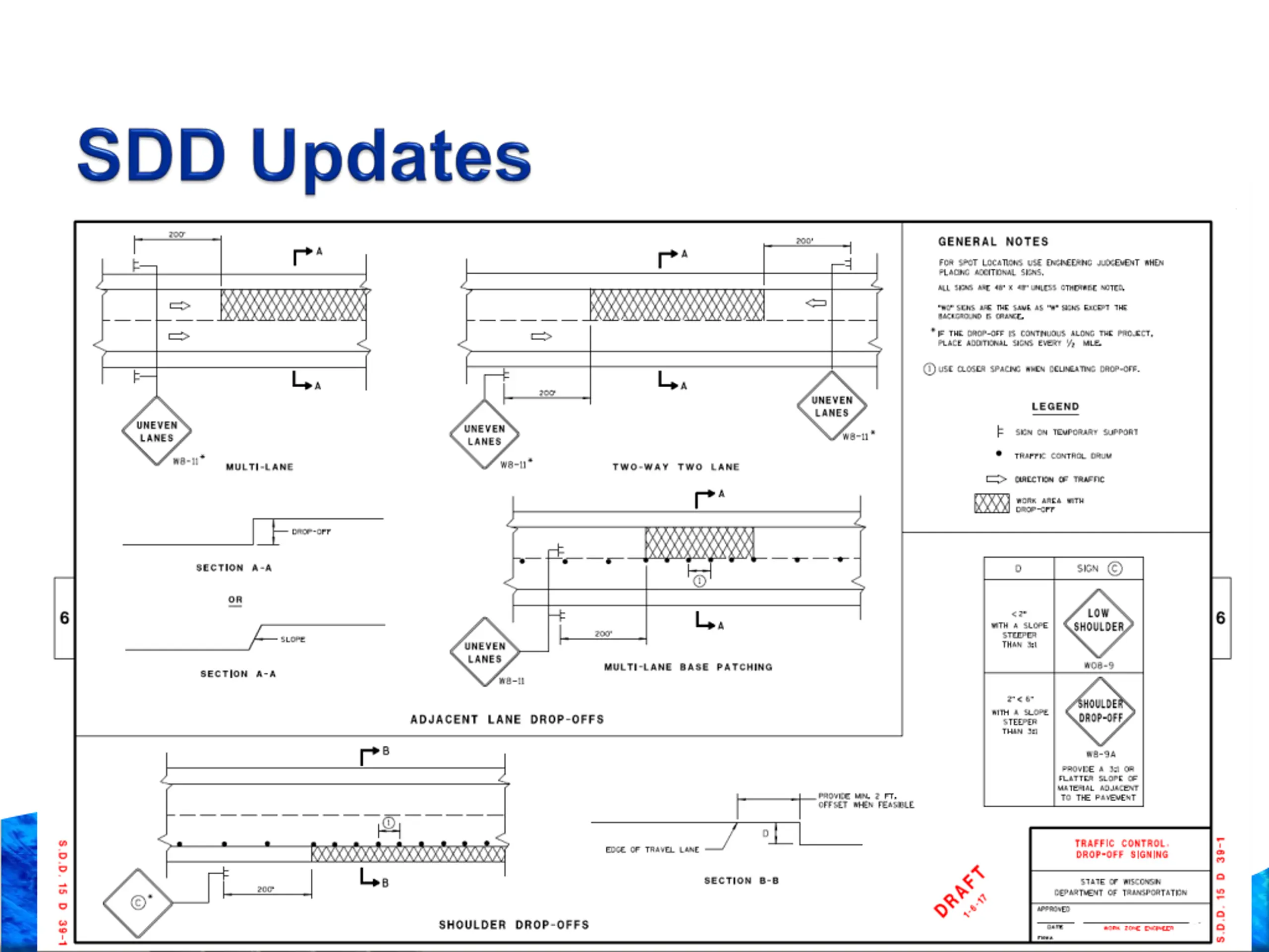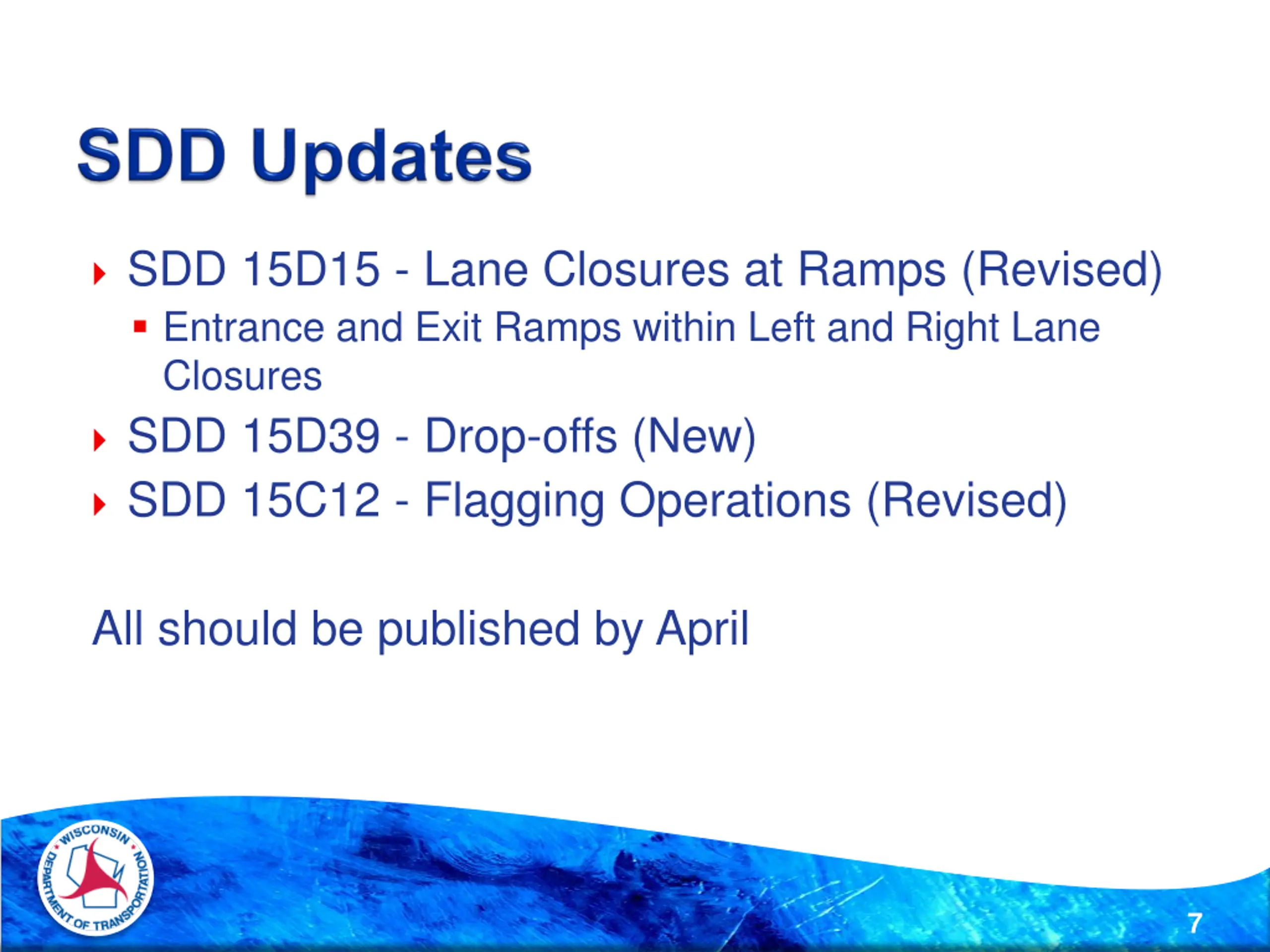 SDD 15D15 - Lane Closures at Ramps (Revised) Entrance and Exit Ramps within Left and Right Lane Closures SDD 15D39 - Drop-offs (New) SDD 15C12 - Flagging Operations (Revised) All should be published by April 7