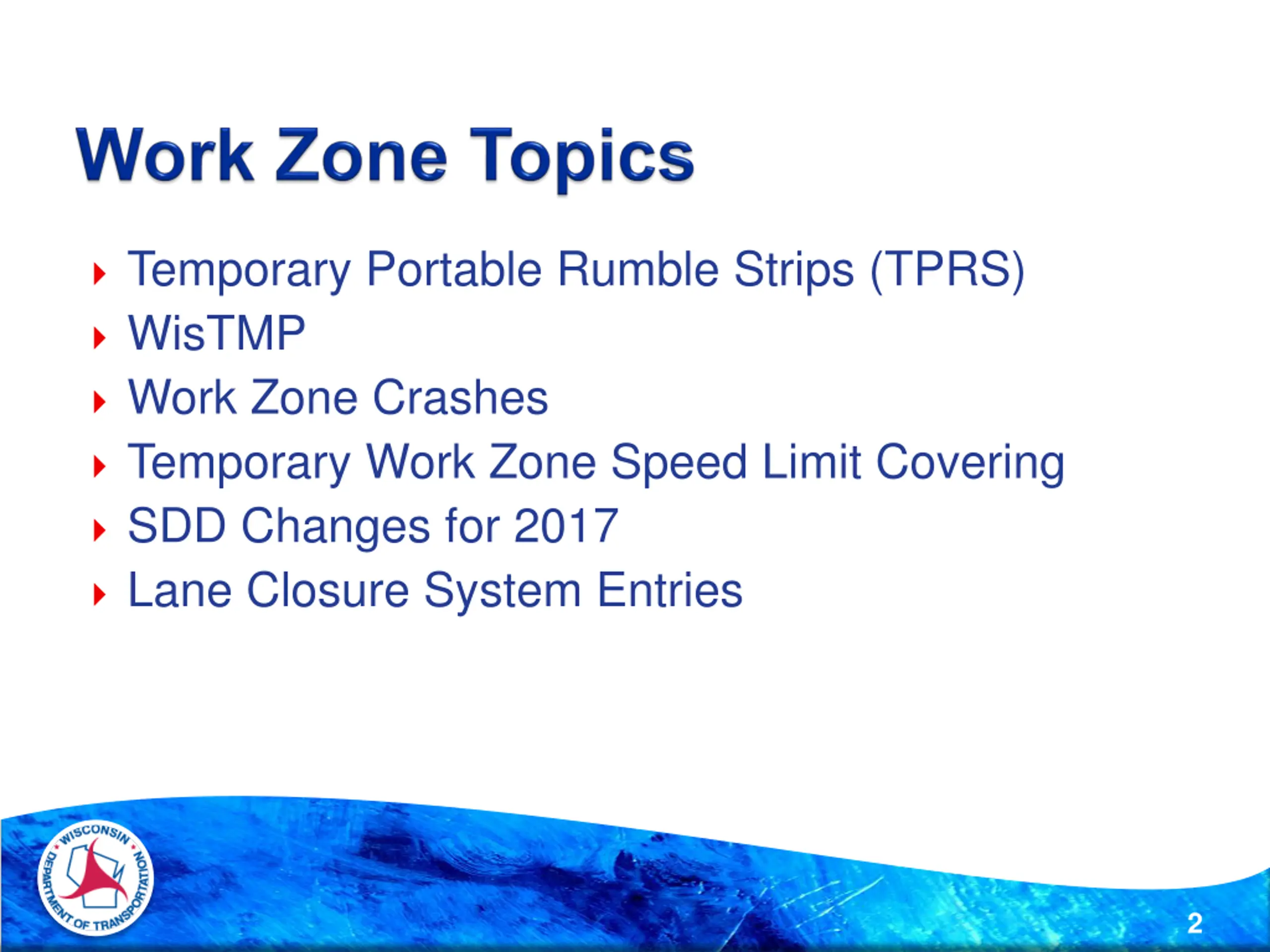 Temporary Portable Rumble Strips (TPRS) WisTMP Work Zone Crashes Temporary Work Zone Speed Limit Covering SDD Changes for 2017 Lane Closure System Entries 2