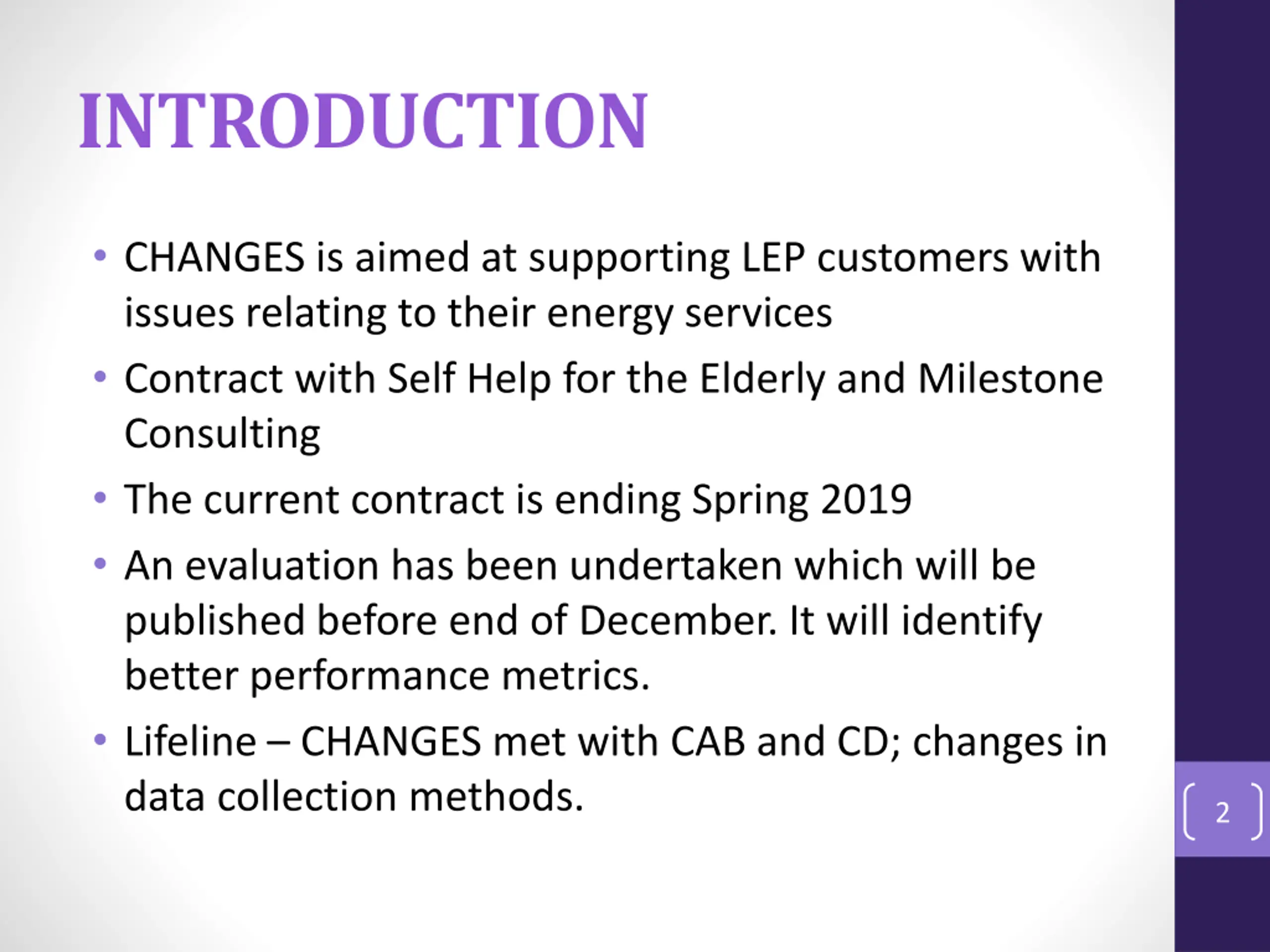 INTRODUCTION CHANGES is aimed at supporting LEP customers with issues relating to their energy services Contract with Self Help for the Elderly and Milestone Consulting The current contract is ending Spring 2019 An evaluation has been undertaken which will be published before end of December. It will identify better performance metrics. Lifeline CHANGES met with CAB and CD; changes in data collection methods. 2