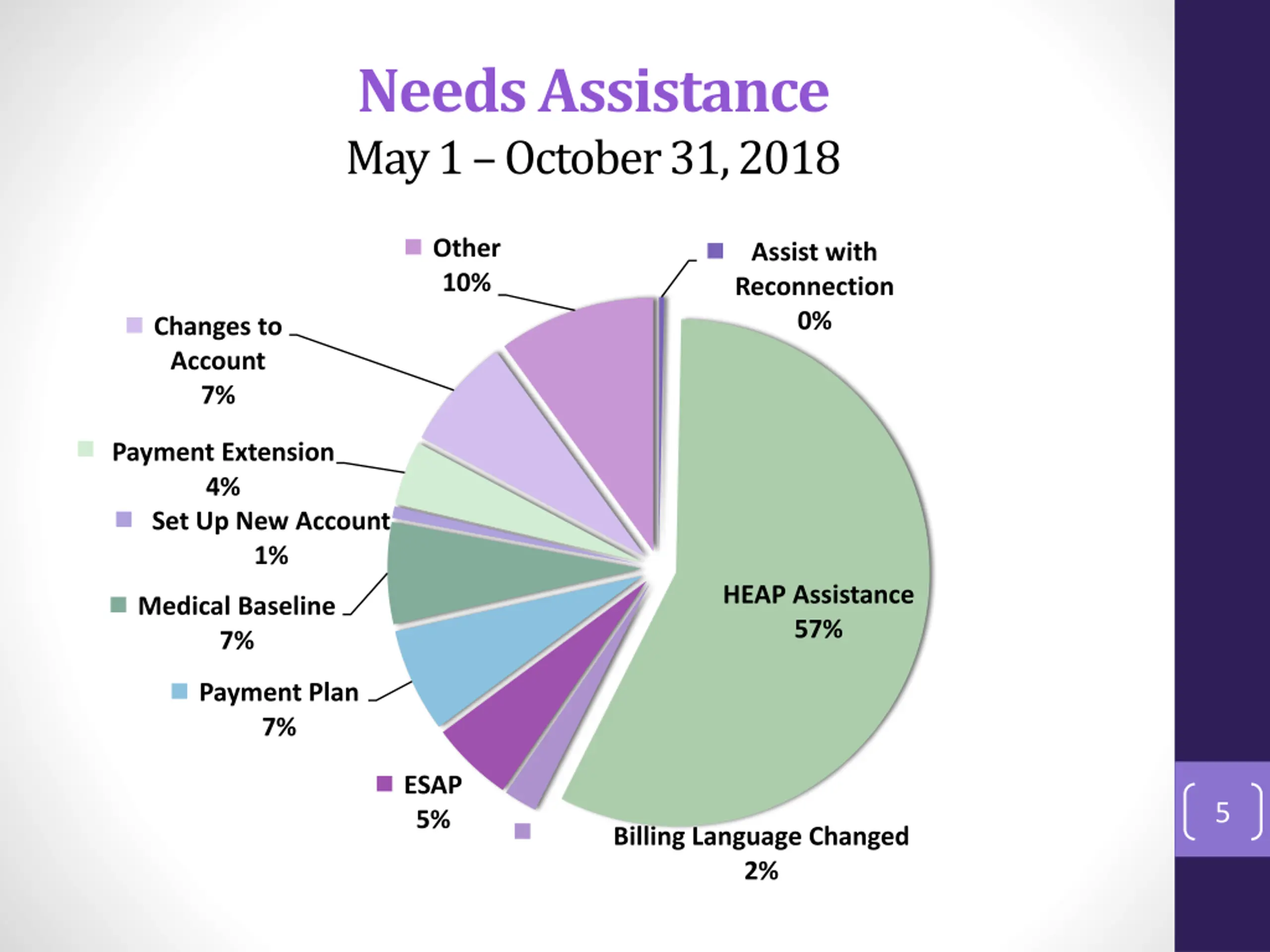 Needs Assistance May 1 October 31, 2018 Other 10% Assist with Reconnection 0% Changes to Account 7% Payment Extension 4% Set Up New Account 1% HEAP Assistance 57% Medical Baseline 7% Payment Plan 7% ESAP 5% 5 Billing Language Changed 2%