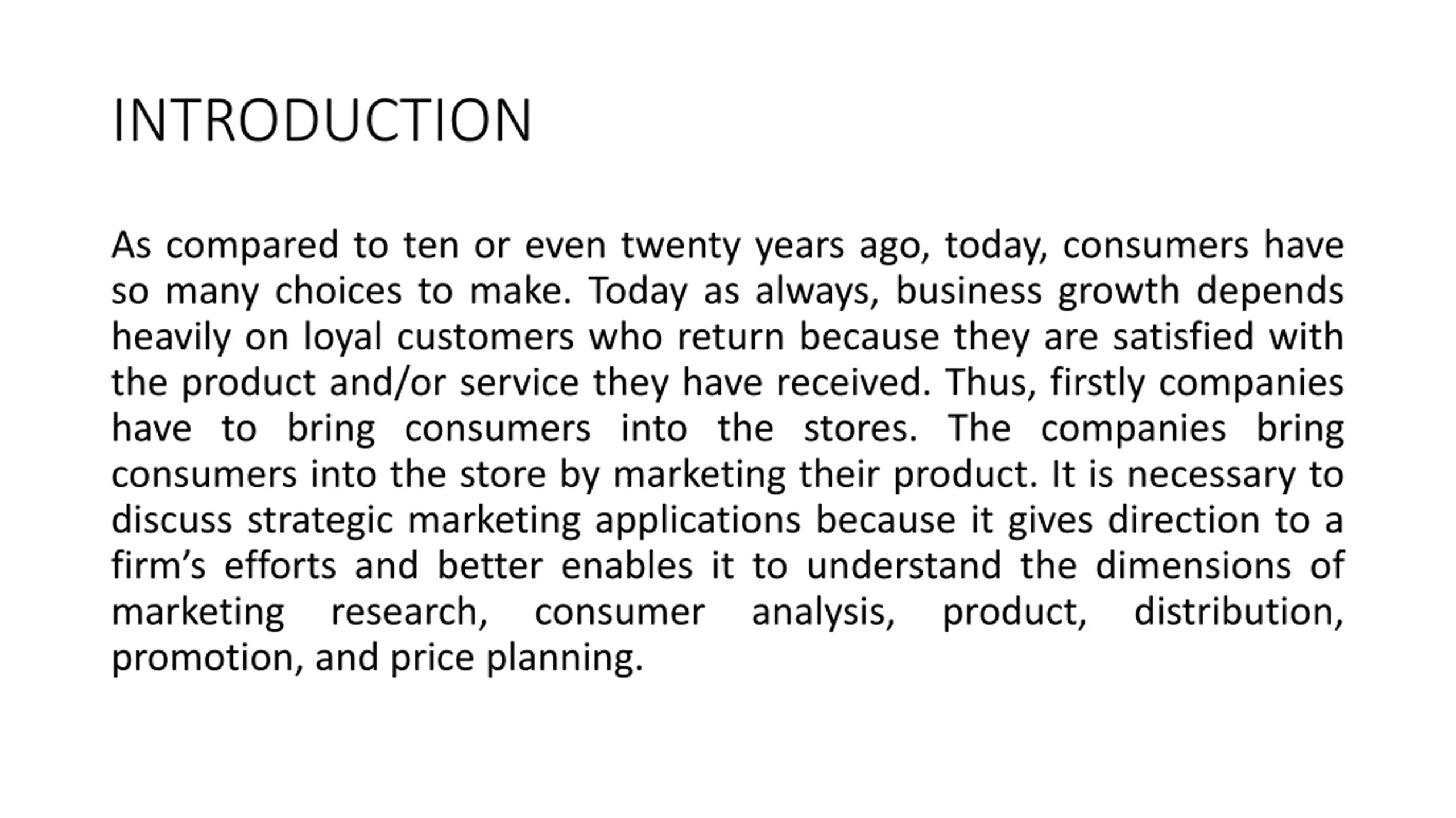 INTRODUCTION As compared to ten or even twenty years ago, today, consumers have so many choices to make. Today as always, business growth depends heavily on loyal customers who return because they are satisfied with the product and/or service they have received. Thus, firstly companies have to bring consumers into the stores. The companies bring consumers into the store by marketing their product. It is necessary to discuss strategic marketing applications because it gives direction to a firm s efforts and better enables it to understand the dimensions of marketing research, consumer promotion, and price planning. analysis, product, distribution,