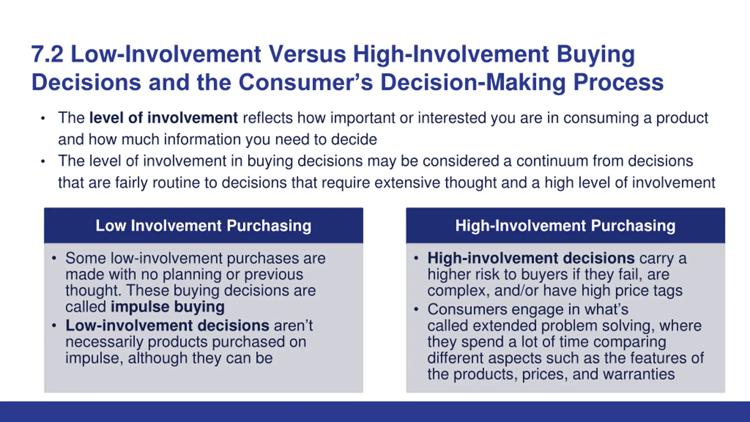 7.2 Low-Involvement Versus High-Involvement Buying Decisions and the Consumer s Decision-Making Process The level of involvement reflects how important or interested you are in consuming a product and how much information you need to decide The level of involvement in buying decisions may be considered a continuum from decisions that are fairly routine to decisions that require extensive thought and a high level of involvement Low Involvement Purchasing High-Involvement Purchasing Some low-involvement purchases are made with no planning or previous thought. These buying decisions are called impulse buying Low-involvement decisions aren t necessarily products purchased on impulse, although they can be High-involvement decisions carry a higher risk to buyers if they fail, are complex, and/or have high price tags Consumers engage in what s called extended problem solving, where they spend a lot of time comparing different aspects such as the features of the products, prices, and warranties