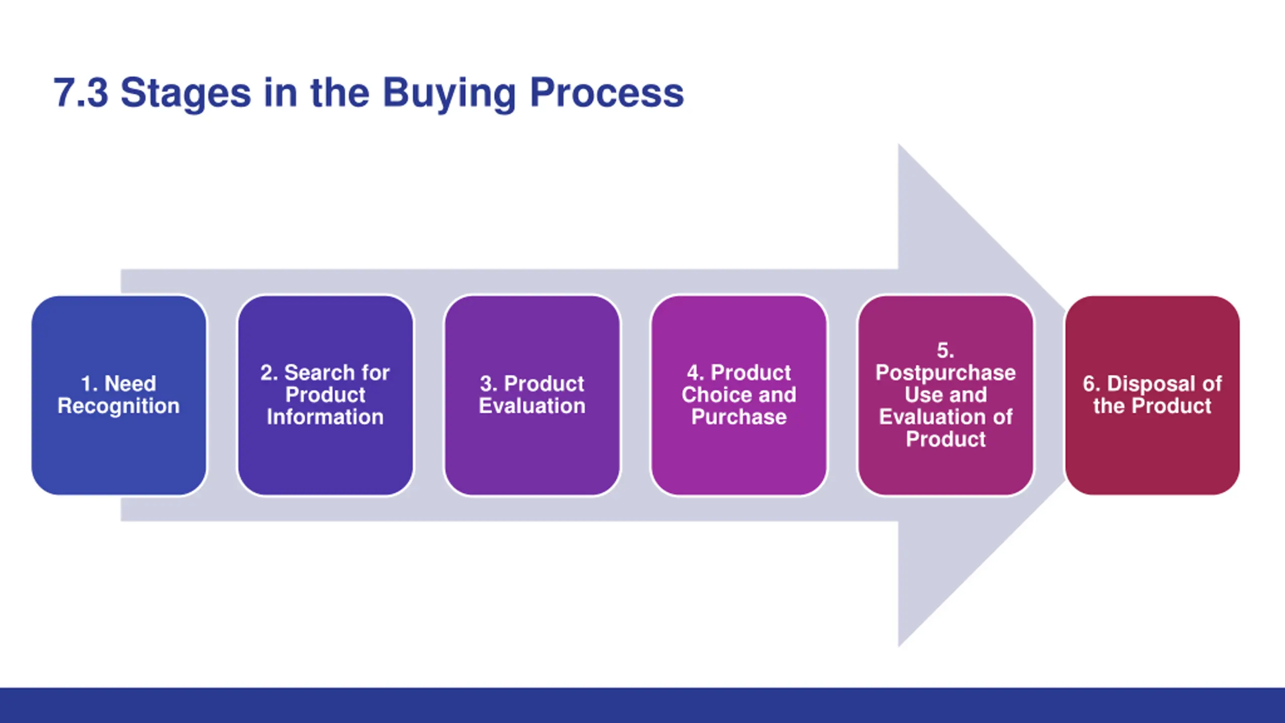 7.3 Stages in the Buying Process 5. 2. Search for Product Information 4. Product Choice and Purchase Postpurchase Use and Evaluation of Product 1. Need Recognition 3. Product Evaluation 6. Disposal of the Product