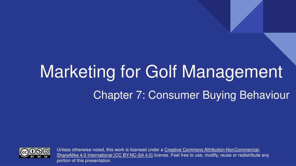 Marketing for Golf Management Chapter 7: Consumer Buying Behaviour Creative Commons Attribution-NonCommercial-ShareAlike 4.0 International (CC BY-NC-SA 4.0) Creative Commons Attribution-NonCommercial-ShareAlike 4.0 International (CC BY-NC-SA 4.0) Unless otherwise noted, this work is licensed under a Creative Commons Attribution-NonCommercial- ShareAlike 4.0 International (CC BY-NC-SA 4.0) license. Feel free to use, modify, reuse or redistribute any portion of this presentation.