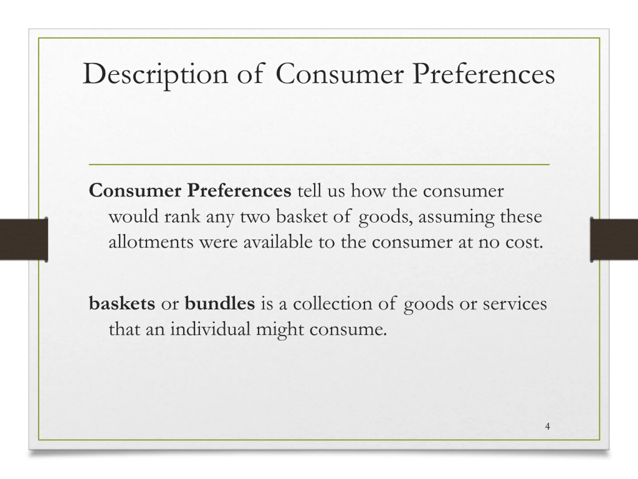 Description of Consumer Preferences Consumer Preferences tell us how the consumer would rank any two basket of goods, assuming these allotments were available to the consumer at no cost. baskets or bundles is a collection of goods or services that an individual might consume. 4