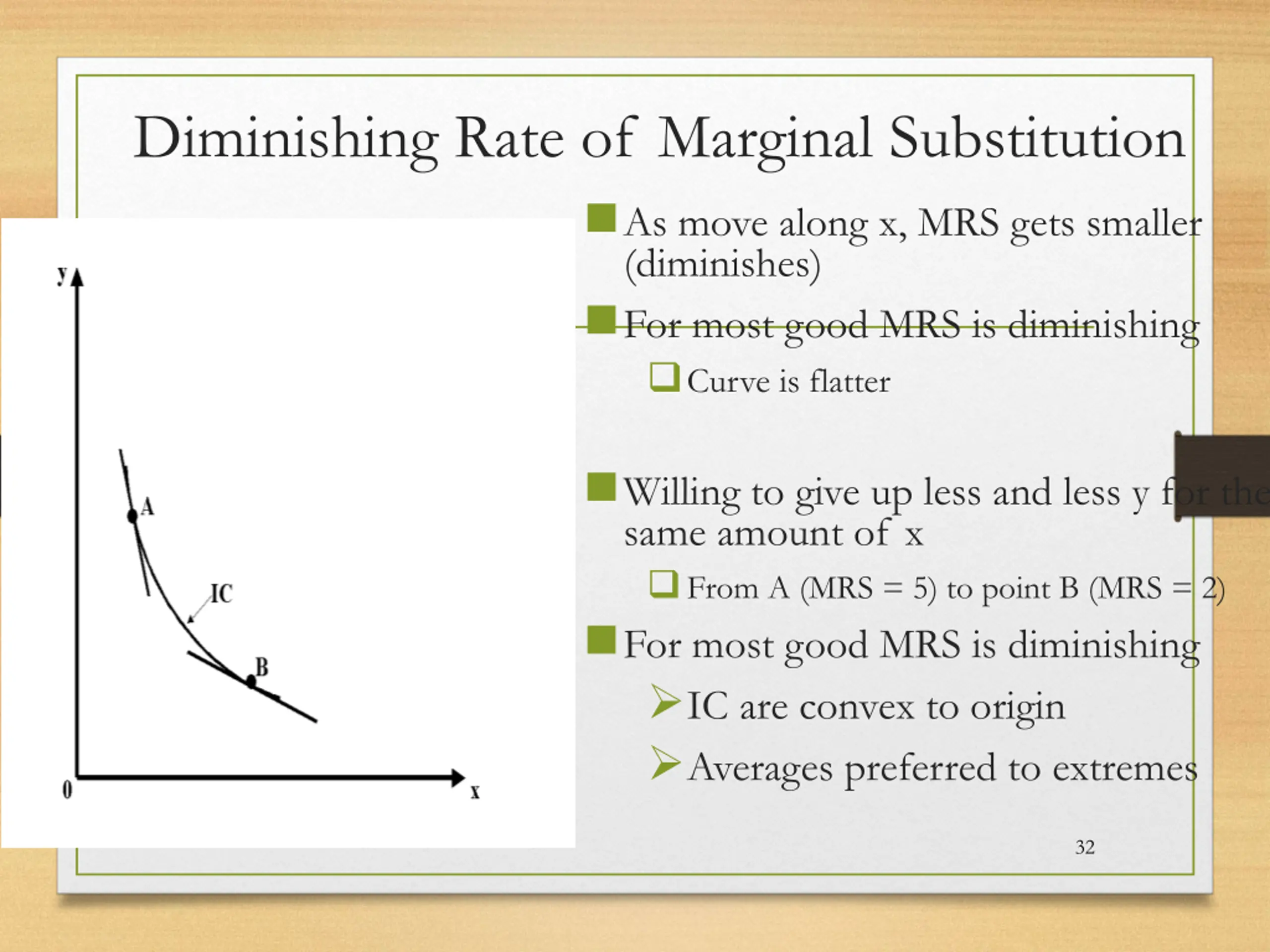 Diminishing Rate of Marginal Substitution As move along x, MRS gets smaller (diminishes) For most good MRS is diminishing Curve is flatter Willing to give up less and less y for the same amount of x From A (MRS = 5) to point B (MRS = 2) For most good MRS is diminishing IC are convex to origin Averages preferred to extremes 32