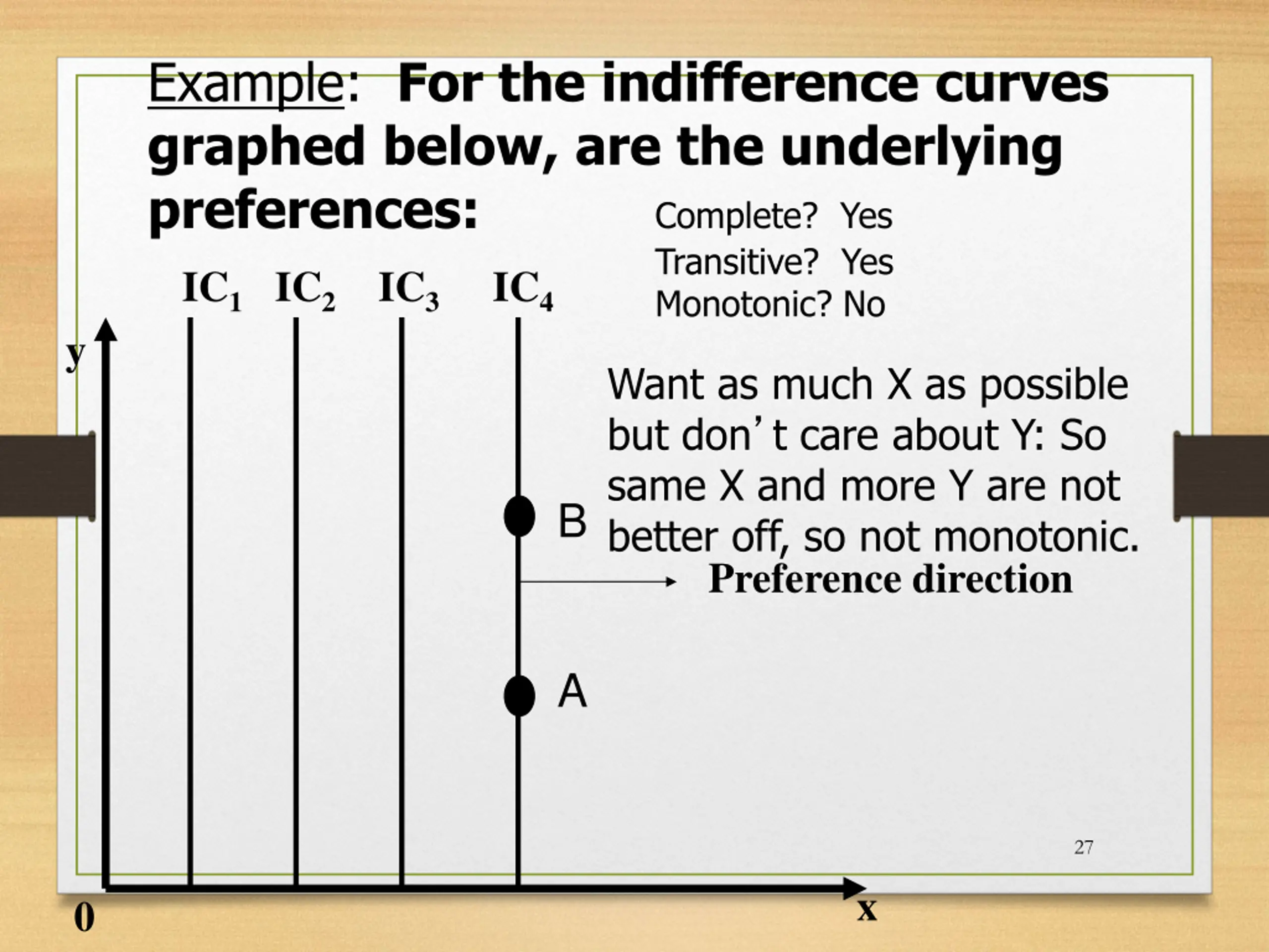 Example: For the indifference curves graphed below, are the underlying preferences: Want as much X as possible but don t care about Y: So same X and more Y are not better off, so not monotonic. B Complete? Yes Transitive? Yes Monotonic? No IC1 IC2 IC3 IC4 y Preference direction A 27 x 0