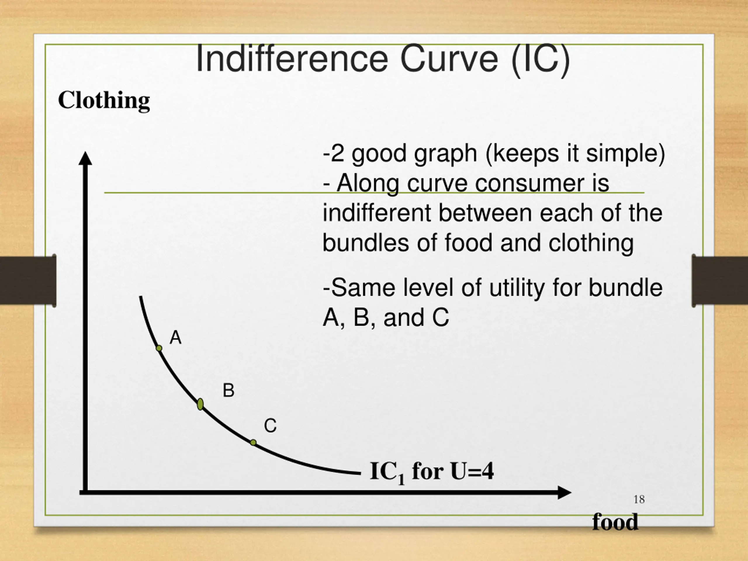 Indifference Curve (IC) Clothing -2 good graph (keeps it simple) - Along curve consumer is indifferent between each of the bundles of food and clothing -Same level of utility for bundle A, B, and C A B C IC1 for U=4 18 food