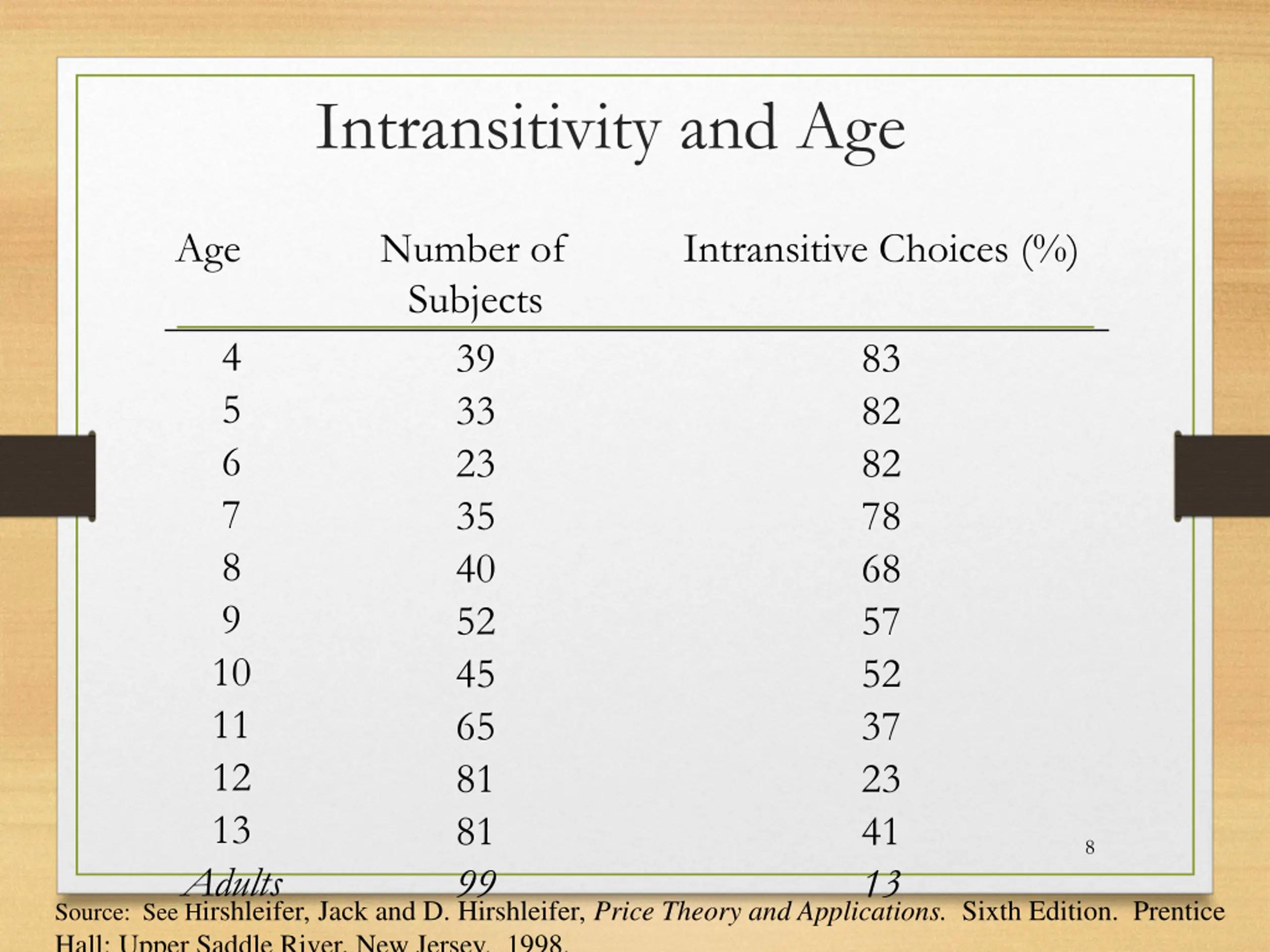 Intransitivity and Age Age Number of Subjects 39 33 23 35 40 52 45 65 81 81 99 Intransitive Choices (%) 4 5 6 7 8 9 83 82 82 78 68 57 52 37 23 41 13 10 11 12 13 8 Adults Source: See Hirshleifer, Jack and D. Hirshleifer, Price Theory and Applications. Sixth Edition. Prentice Hall: Upper Saddle River, New Jersey. 1998.