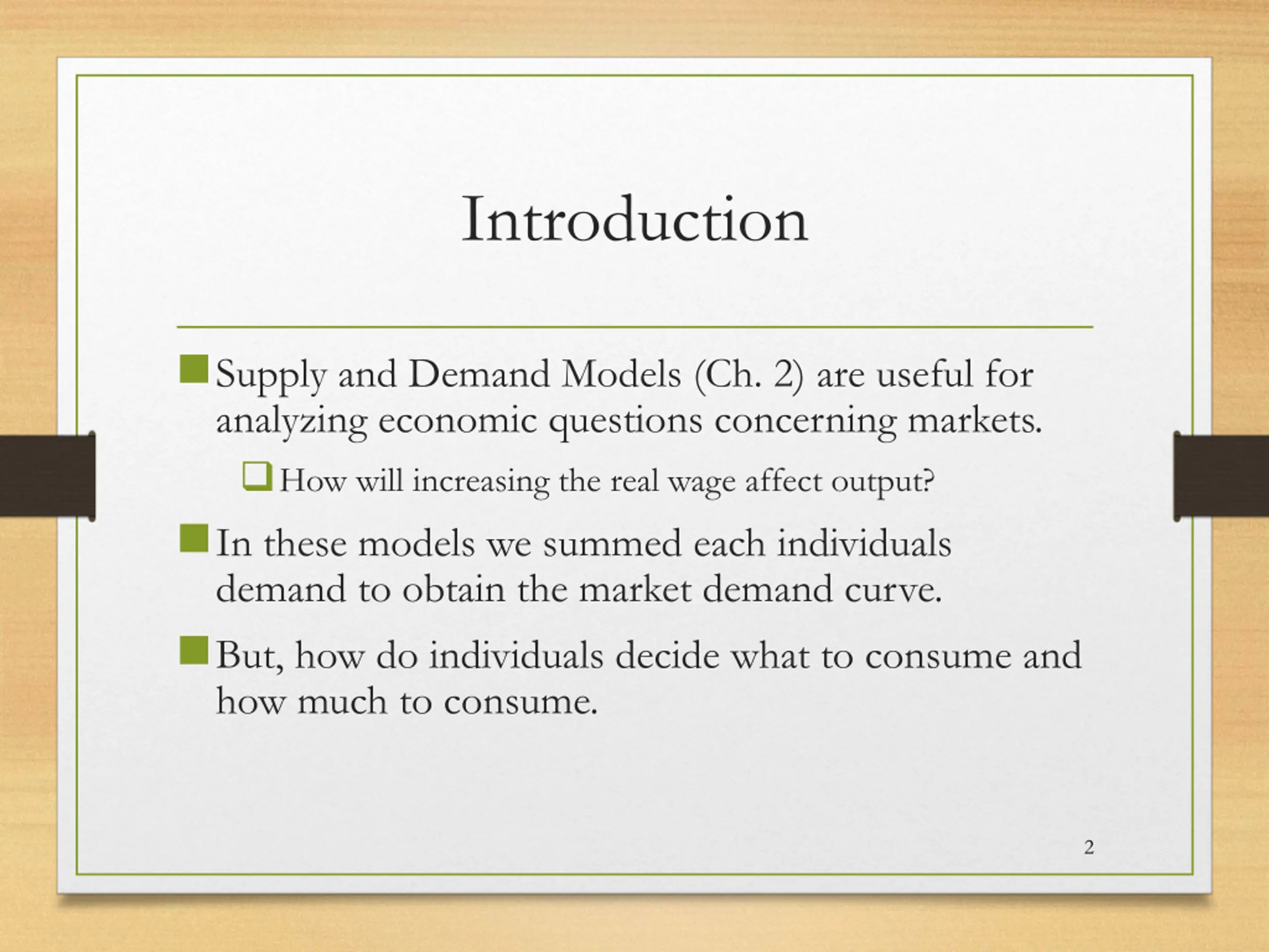 Introduction Supply and Demand Models (Ch. 2) are useful for analyzing economic questions concerning markets. How will increasing the real wage affect output? In these models we summed each individuals demand to obtain the market demand curve. But, how do individuals decide what to consume and how much to consume. 2