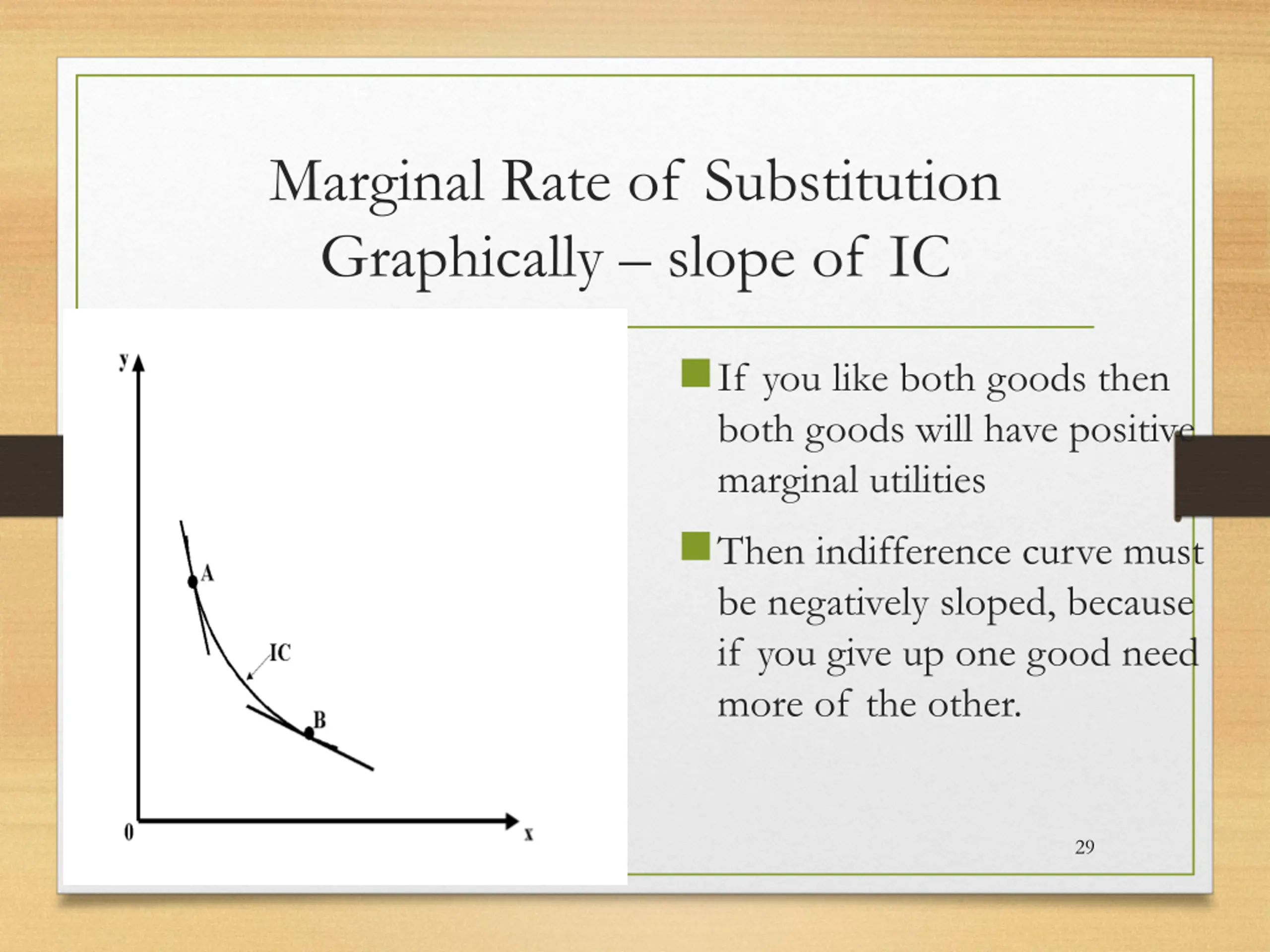 Marginal Rate of Substitution Graphically slope of IC If you like both goods then both goods will have positive marginal utilities Then indifference curve must be negatively sloped, because if you give up one good need more of the other. 29