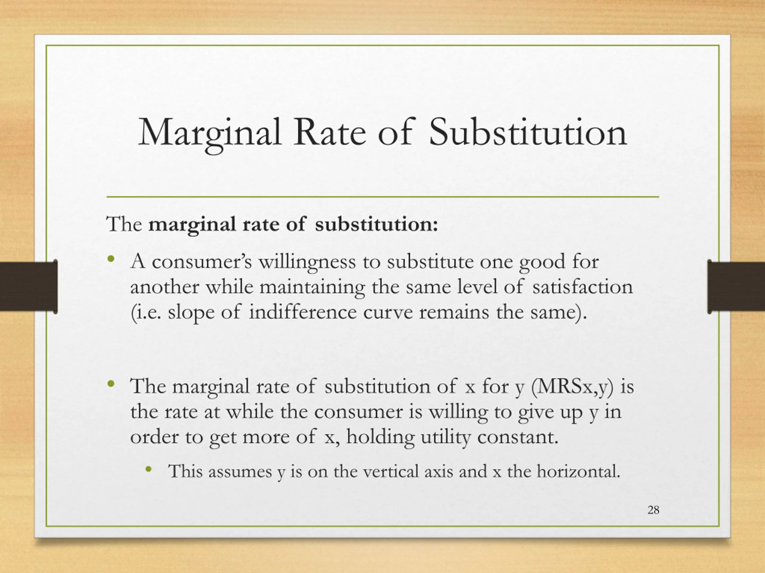 Marginal Rate of Substitution The marginal rate of substitution: A consumer s willingness to substitute one good for another while maintaining the same level of satisfaction (i.e. slope of indifference curve remains the same). The marginal rate of substitution of x for y (MRSx,y) is the rate at while the consumer is willing to give up y in order to get more of x, holding utility constant. This assumes y is on the vertical axis and x the horizontal. 28