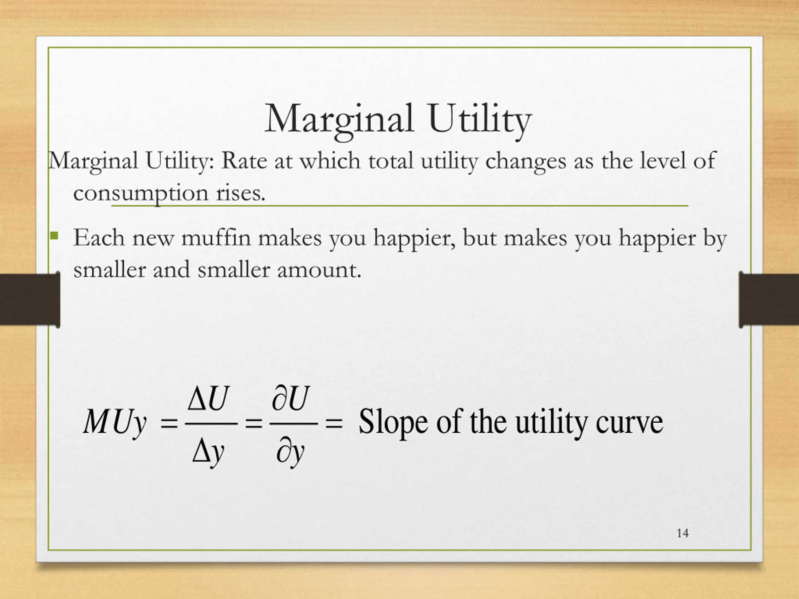 Marginal Utility Marginal Utility: Rate at which total utility changes as the level of consumption rises. Each new muffin makes you happier, but makes you happier by smaller and smaller amount. U y U y = = = Slope of the utility curve MUy 14