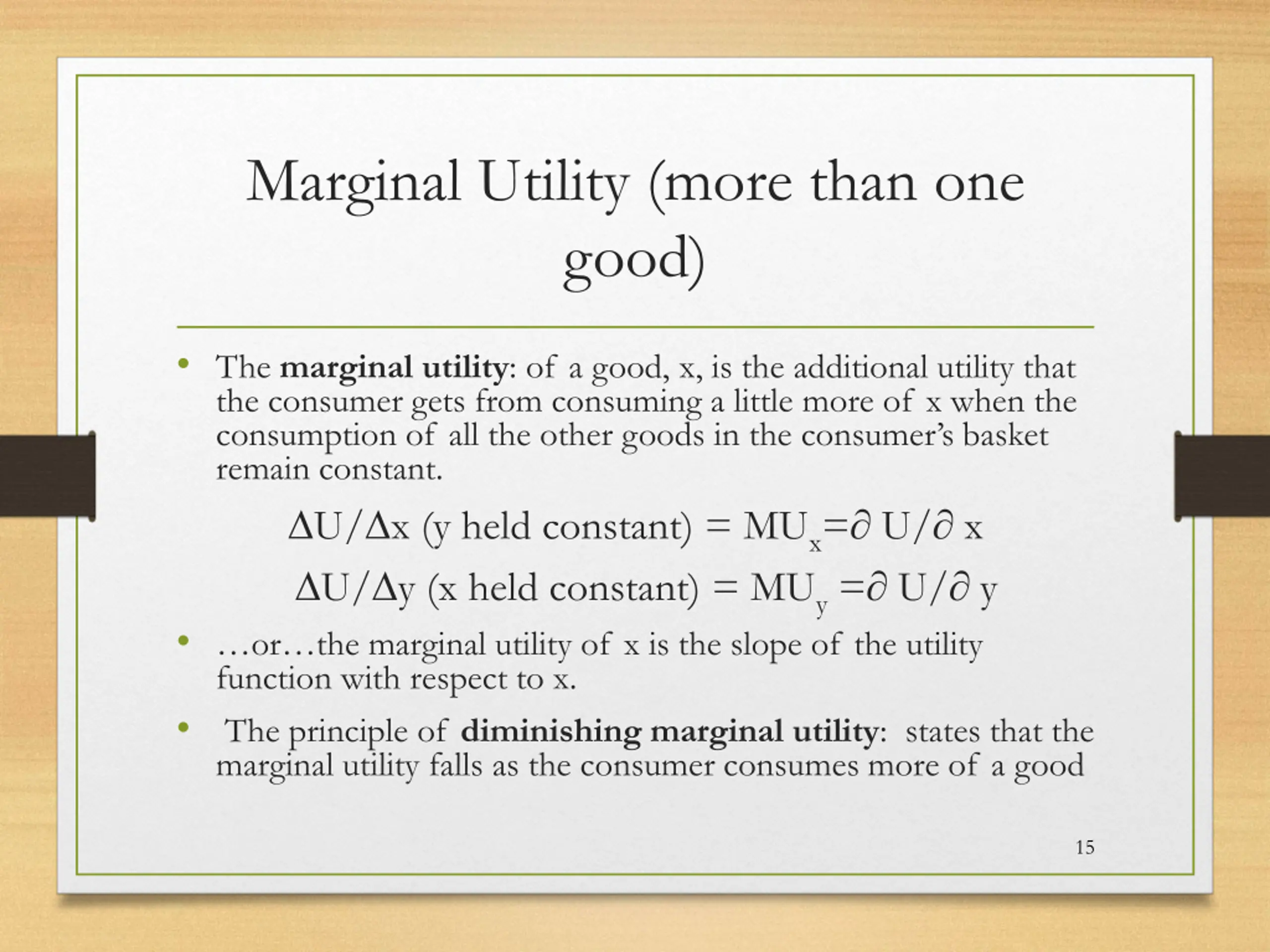 Marginal Utility (more than one good) The marginal utility: of a good, x, is the additional utility that the consumer gets from consuming a little more of x when the consumption of all the other goods in the consumer s basket remain constant. U/ x (y held constant) = MUx= U/ x U/ y (x held constant) = MUy= U/ y or the marginal utility of x is the slope of the utility function with respect to x. The principle of diminishing marginal utility: states that the marginal utility falls as the consumer consumes more of a good 15