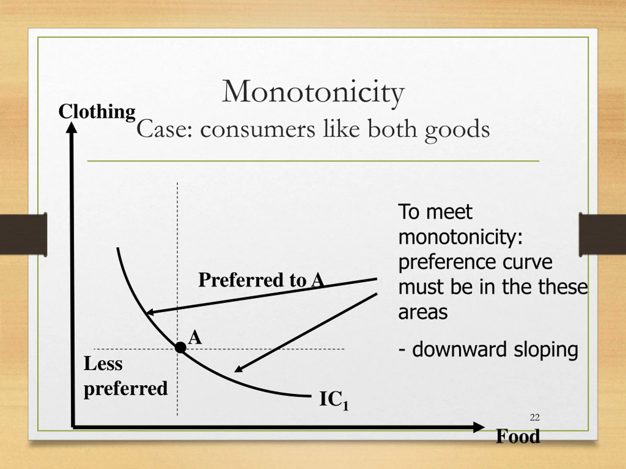 Monotonicity Case: consumers like both goods Clothing To meet monotonicity: preference curve must be in the these areas Preferred to A A - downward sloping Less preferred IC1 22 Food