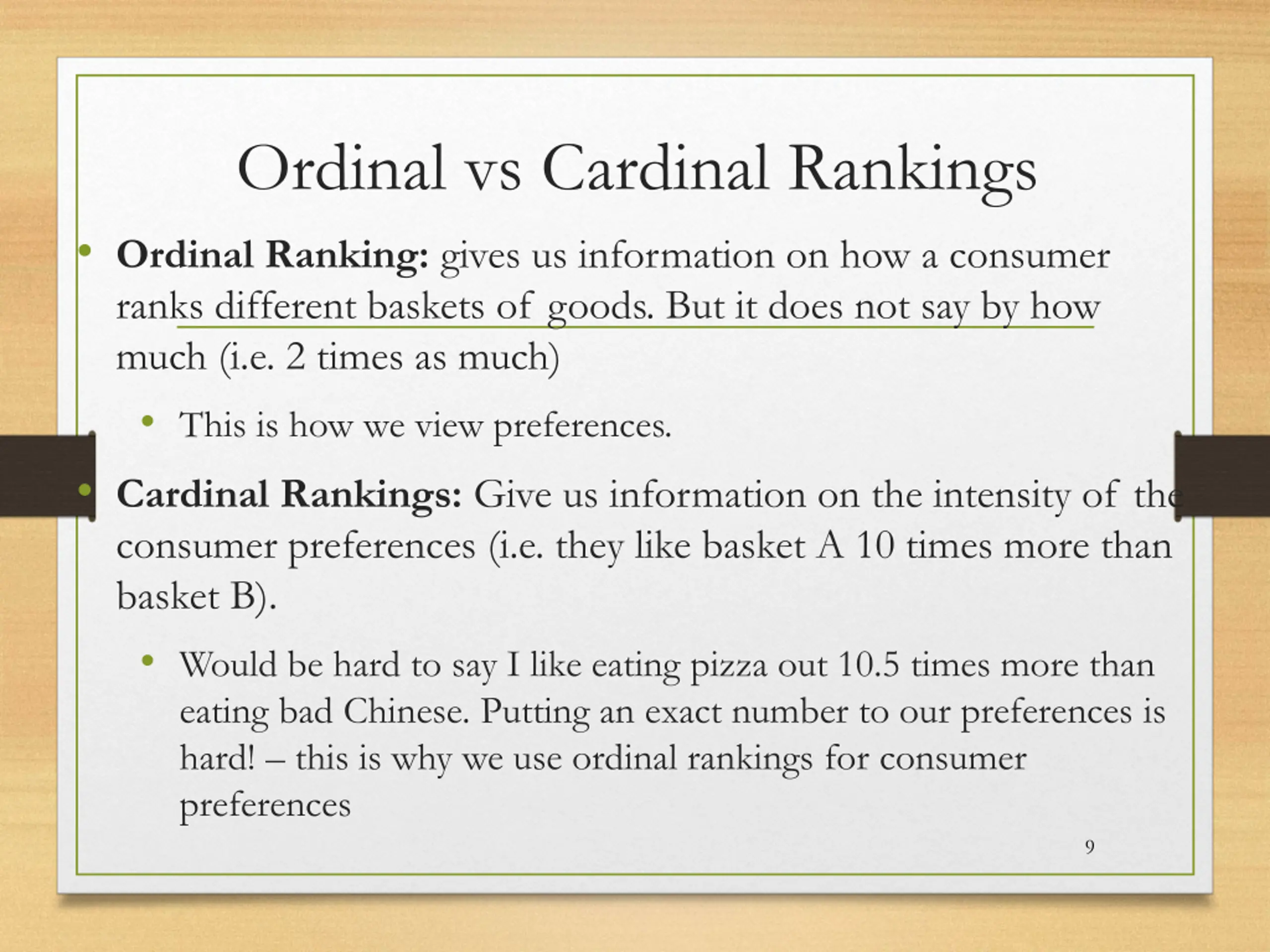 Ordinal vs Cardinal Rankings Ordinal Ranking: gives us information on how a consumer ranks different baskets of goods. But it does not say by how much (i.e. 2 times as much) This is how we view preferences. Cardinal Rankings: Give us information on the intensity of the consumer preferences (i.e. they like basket A 10 times more than basket B). Would be hard to say I like eating pizza out 10.5 times more than eating bad Chinese. Putting an exact number to our preferences is hard! this is why we use ordinal rankings for consumer preferences 9