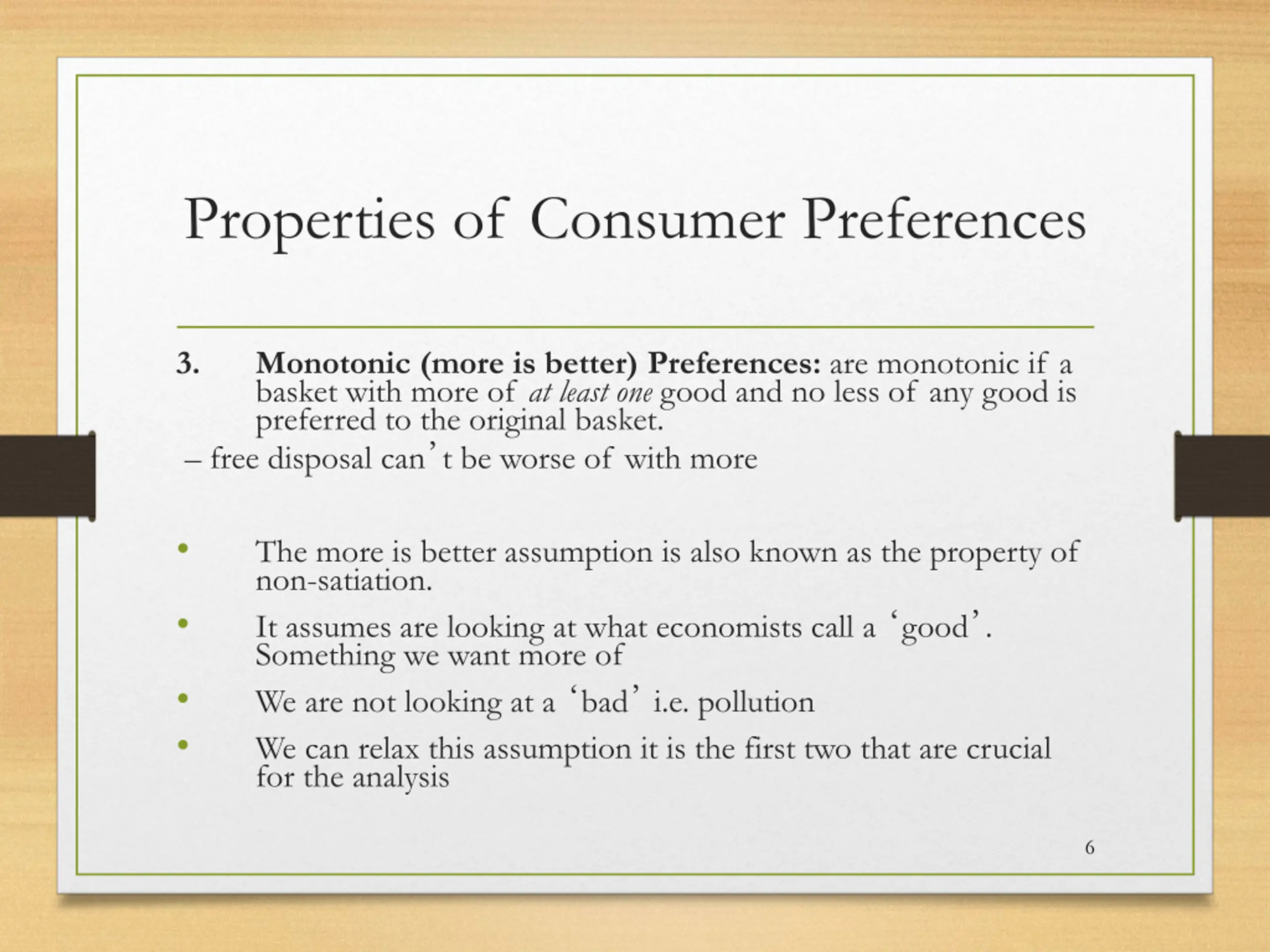Properties of Consumer Preferences 3. Monotonic (more is better) Preferences: are monotonic if a basket with more of at least one good and no less of any good is preferred to the original basket. free disposal can t be worse of with more The more is better assumption is also known as the property of non-satiation. It assumes are looking at what economists call a good . Something we want more of We are not looking at a bad i.e. pollution We can relax this assumption it is the first two that are crucial for the analysis 6