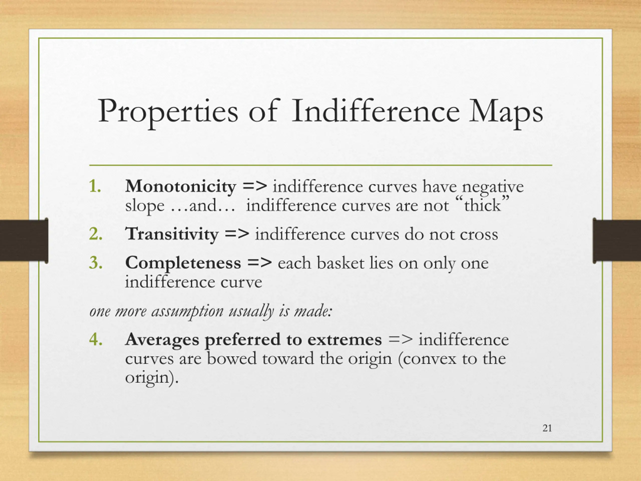 Properties of Indifference Maps 1. Monotonicity => indifference curves have negative slope and indifference curves are not thick Transitivity => indifference curves do not cross Completeness => each basket lies on only one indifference curve one more assumption usually is made: 4. Averages preferred to extremes => indifference curves are bowed toward the origin (convex to the origin). 2. 3. 21