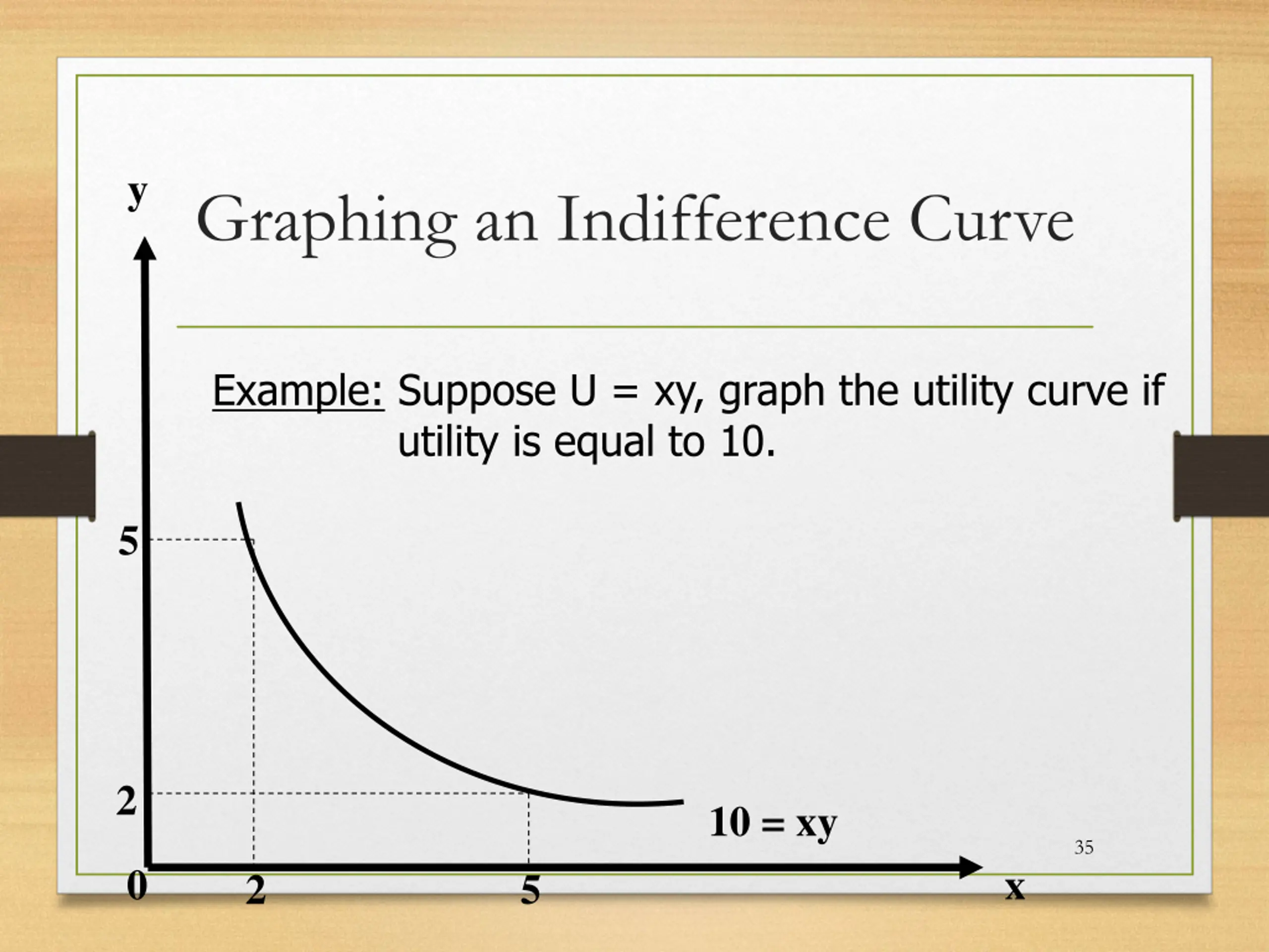 y Graphing an Indifference Curve Example: Suppose U = xy, graph the utility curve if utility is equal to 10. 5 2 10 = xy 35 0 x 2 5