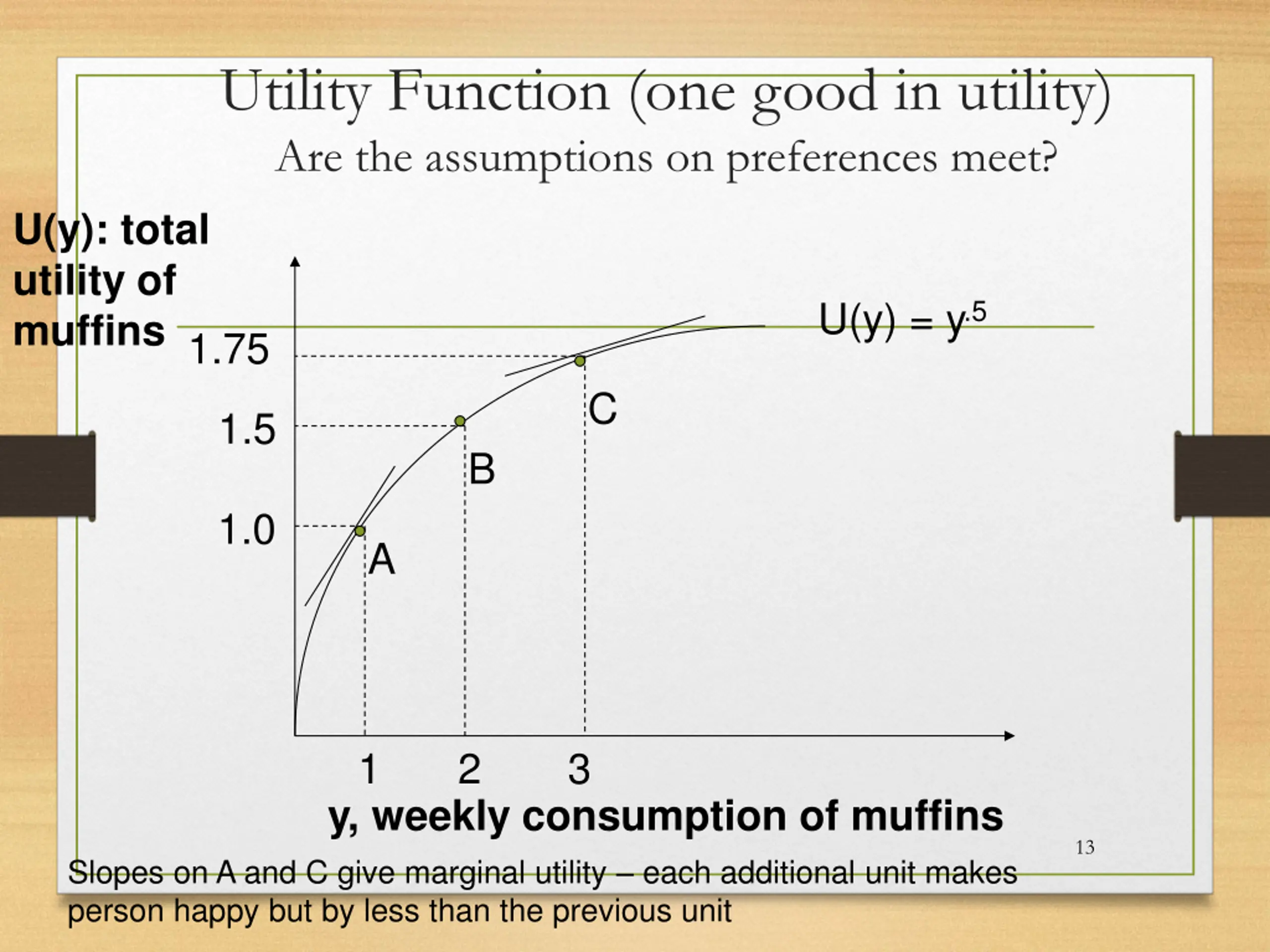 Utility Function (one good in utility) Are the assumptions on preferences meet? U(y): total utility of muffins 1.75 U(y) = y.5 C 1.5 B 1.0 A 1 2 3 y, weekly consumption of muffins Slopes on A and C give marginal utility each additional unit makes person happy but by less than the previous unit 13