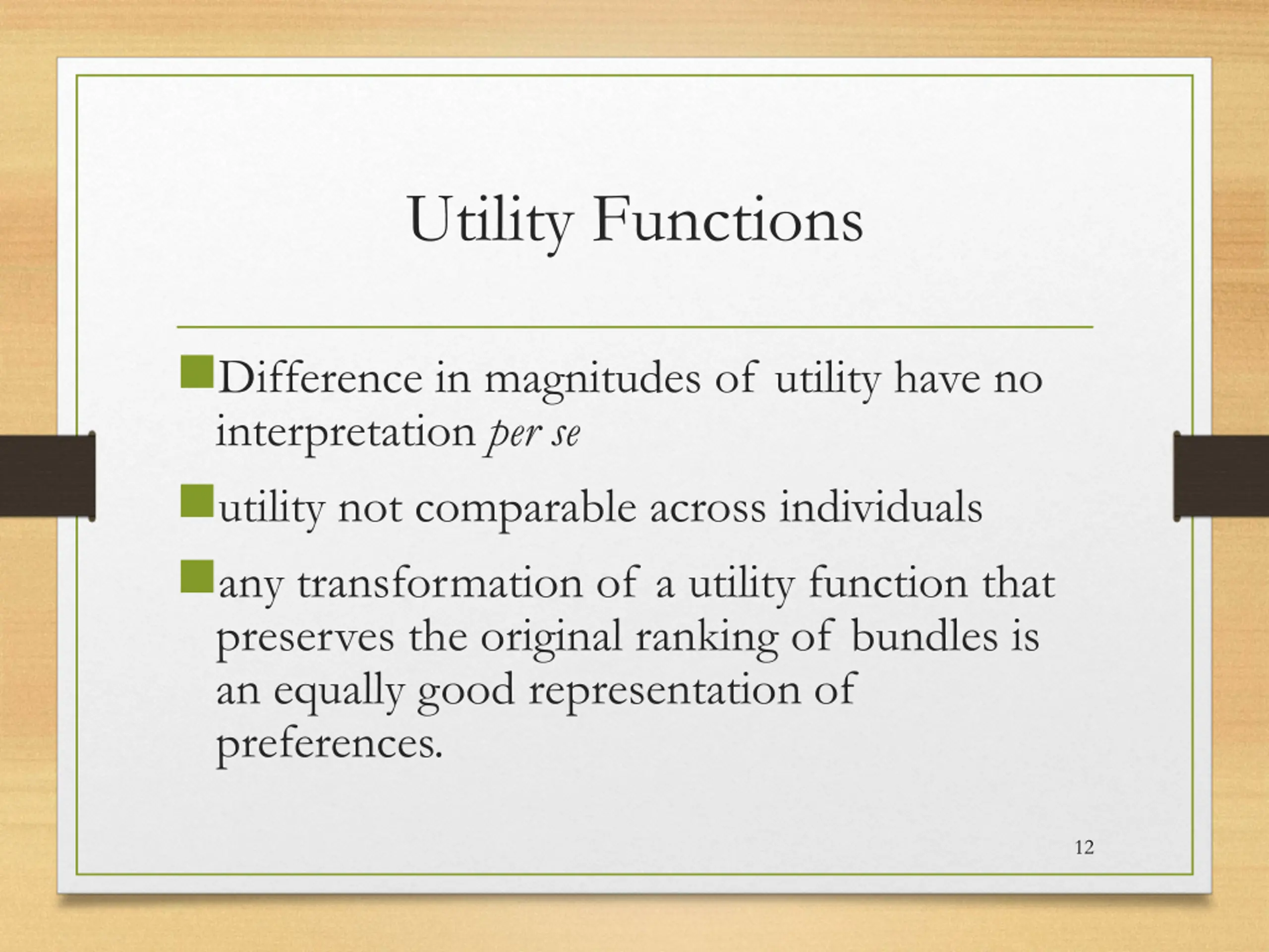 Utility Functions Difference in magnitudes of utility have no interpretation per se utility not comparable across individuals any transformation of a utility function that preserves the original ranking of bundles is an equally good representation of preferences. 12