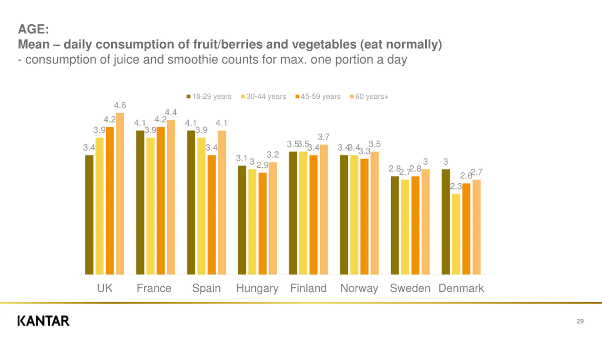 AGE: Mean daily consumption of fruit/berries and vegetables (eat normally) - consumption of juice and smoothie counts for max. one portion a day 18-29 years 30-44 years 45-59 years 60 years+ 4.6 4.4 4.2 4.2 4.1 4.1 4.1 3.9 3.9 3.9 3.7 3.5 3.5 3.5 3.4 3.4 3.4 3.4 3.4 3.3 3.2 3.1 3 3 3 2.9 2.8 2.8 2.7 2.7 2.6 2.3 UK France Spain Hungary Finland Norway Sweden Denmark 29