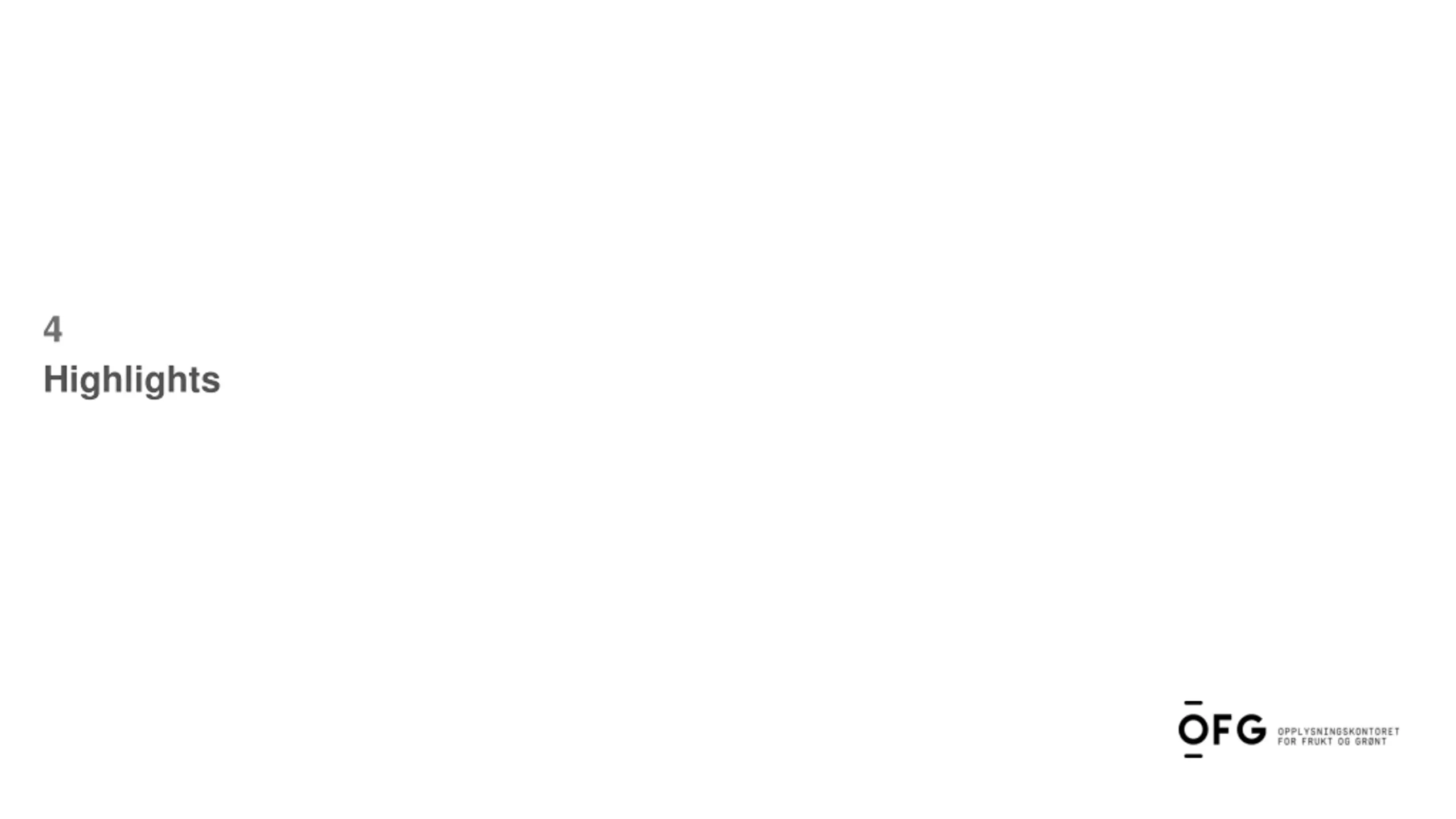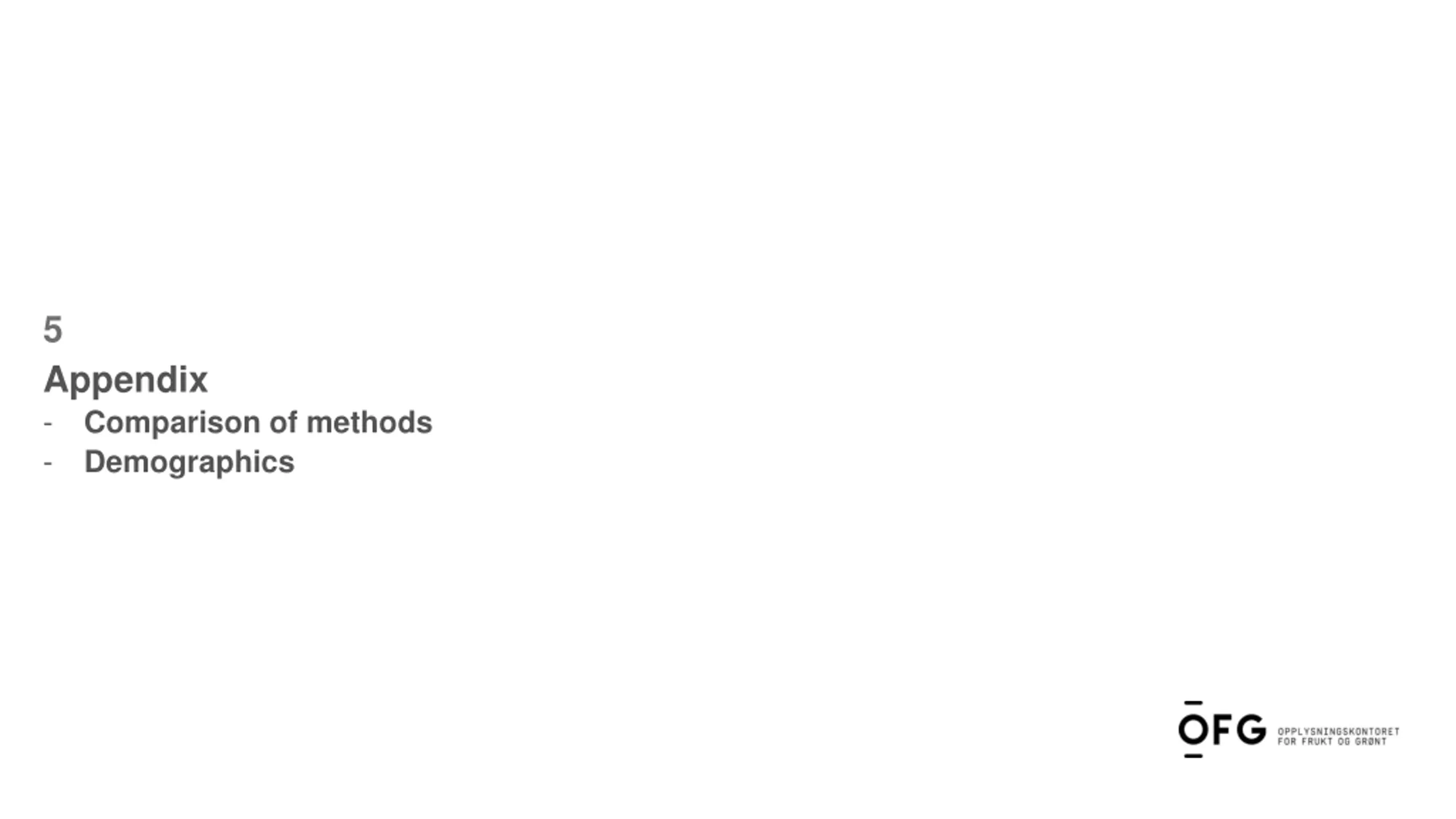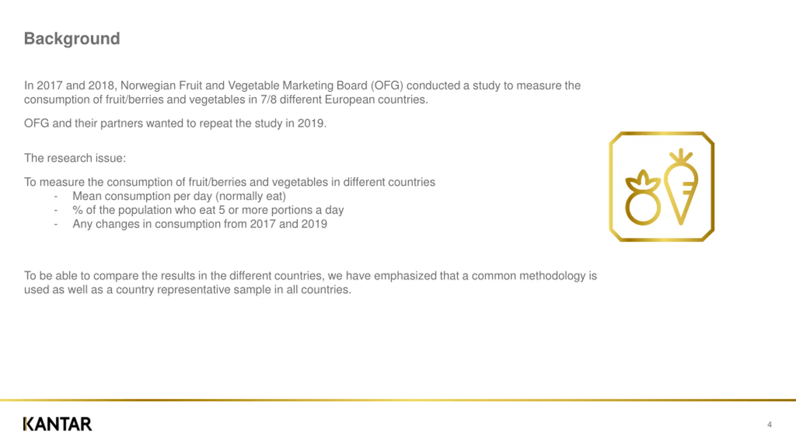 Background In 2017 and 2018, Norwegian Fruit and Vegetable Marketing Board (OFG) conducted a study to measure the consumption of fruit/berries and vegetables in 7/8 different European countries. OFG and their partners wanted to repeat the study in 2019. The research issue: To measure the consumption of fruit/berries and vegetables in different countries - Mean consumption per day (normally eat) - % of the population who eat 5 or more portions a day - Any changes in consumption from 2017 and 2019 To be able to compare the results in the different countries, we have emphasized that a common methodology is used as well as a country representative sample in all countries. 4