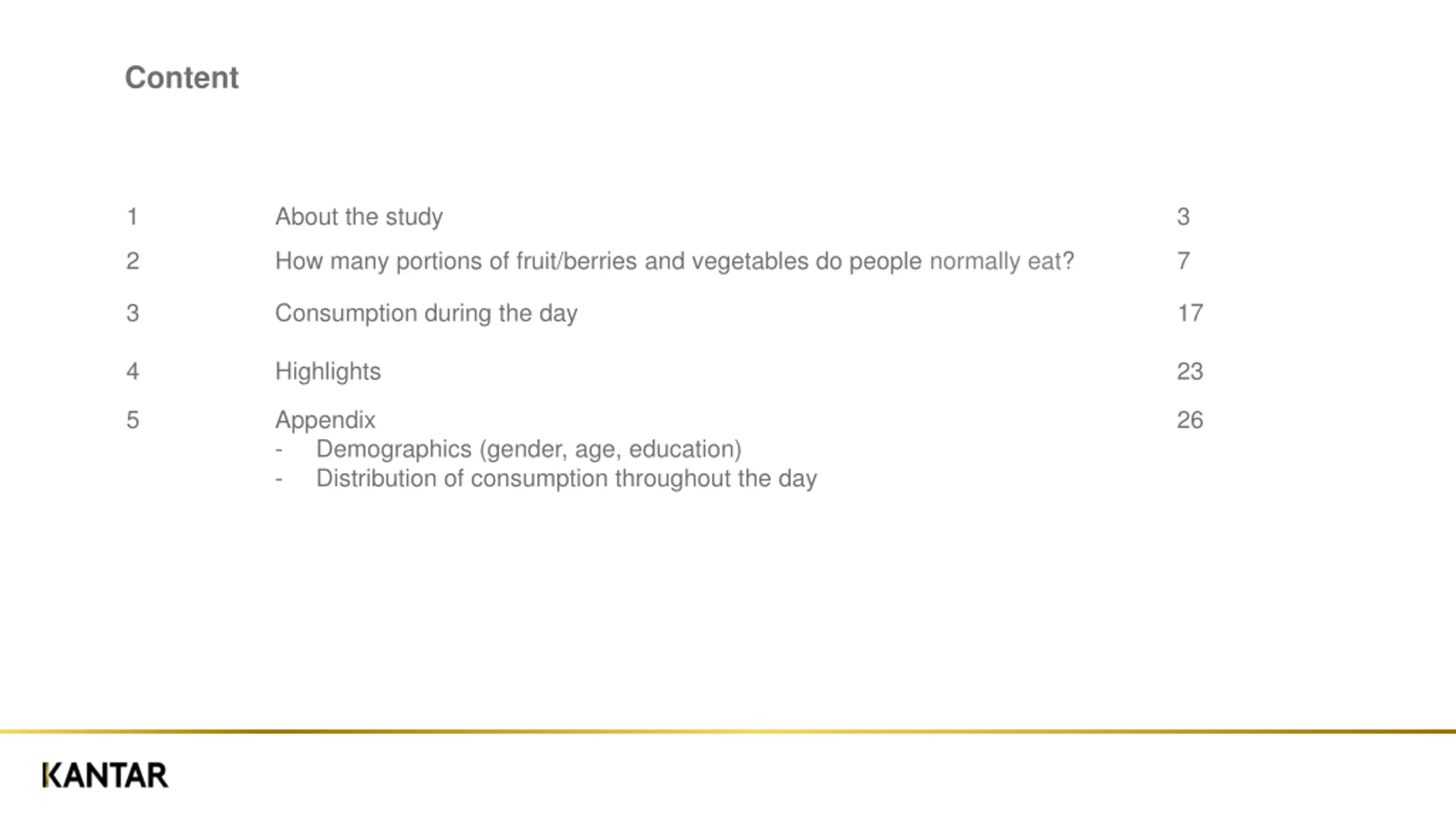 Content 1 About the study 3 2 How many portions of fruit/berries and vegetables do people normally eat? 7 3 Consumption during the day 17 4 Highlights 23 5 Appendix - Demographics (gender, age, education) - Distribution of consumption throughout the day 26
