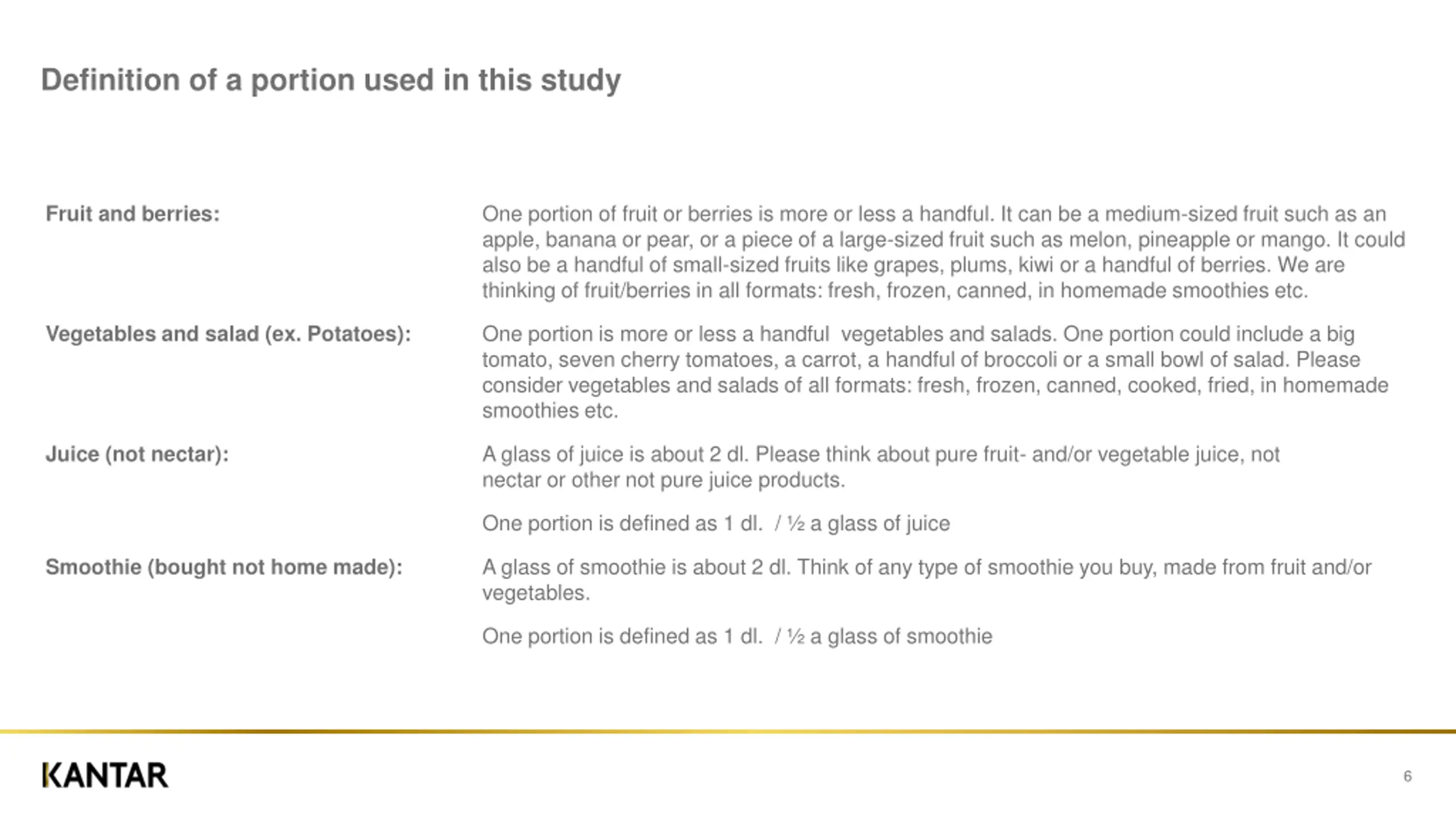 Definition of a portion used in this study Fruit and berries: One portion of fruit or berries is more or less a handful. It can be a medium-sized fruit such as an apple, banana or pear, or a piece of a large-sized fruit such as melon, pineapple or mango. It could also be a handful of small-sized fruits like grapes, plums, kiwi or a handful of berries. We are thinking of fruit/berries in all formats: fresh, frozen, canned, in homemade smoothies etc. One portion is more or less a handful vegetables and salads. One portion could include a big tomato, seven cherry tomatoes, a carrot, a handful of broccoli or a small bowl of salad. Please consider vegetables and salads of all formats: fresh, frozen, canned, cooked, fried, in homemade smoothies etc. Vegetables and salad (ex. Potatoes): A glass of juice is about 2 dl. Please think about pure fruit- and/or vegetable juice, not nectar or other not pure juice products. Juice (not nectar): One portion is defined as 1 dl. / a glass of juice Smoothie (bought not home made): A glass of smoothie is about 2 dl. Think of any type of smoothie you buy, made from fruit and/or vegetables. One portion is defined as 1 dl. / a glass of smoothie 6